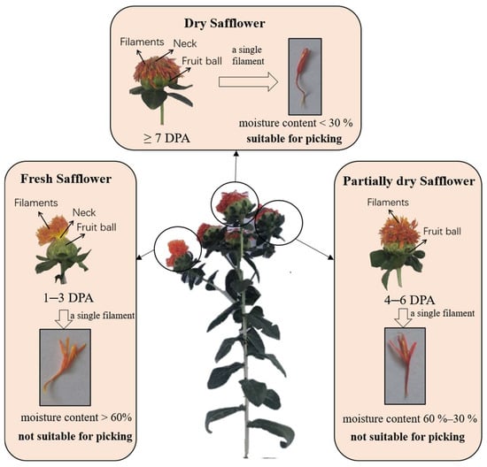 Safflower (Carthamus tinctorius L.), a versatile economic crop, boasts significant application value for its filaments across diverse sectors, including the food industry, traditional medicine, natural textile dyes, bio-based pigments, and cosmetic raw materials [,,]. However, the current reliance on manual harvesting methods presents considerable challenges []. This approach is not only labor-intensive and inefficient, leading to substantially increased picking costs [], but also adversely affects the quality and yield of the final product, thereby severely constraining the industrialization process of dry safflower [,,].