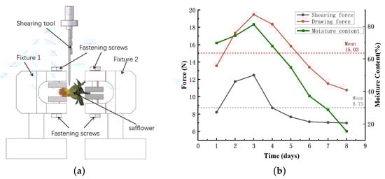 The necking of safflower is a structural feature formed by the overflow of silk clusters []. During filament harvesting, the separation of the filament from the fruit ball occurs precisely at this necking site []. Previous research has indicated that the average force required for filament separation by pulling is 15.03 N []. To explore a more optimal separation method, the shear force between a single filament and the fruit ball was measured using a texture analyzer (Streamline Process Co., Myrtle Beach, SC, USA) [] (Figure 2a), yielding an average value of 8.75 N. Analysis combining these results with moisture content data of the filaments obtained using an electric thermostatic blast drying oven (Strayfield, UK) (Figure 2b) revealed that the binding force between the filament and the fruit ball is positively correlated with the filament moisture content. Furthermore, the shear force was significantly lower than the pulling force, demonstrating that shearing is a more effective pathway for achieving efficient filament separation. Shearing separation has been applied to some extent in safflower harvesting, where mechanical blades generate shearing force to cut the safflower filaments from their attached fruit balls. The same harvesting method has also been successfully applied to other crops, such as green Sichuan peppers [], camellia flower [], and dragon fruit []. However, it requires high positioning accuracy and has low efficiency, making it unsuitable for dry safflower harvesting. This study utilizes the shearing force generated by rotating flexible roller brushes to separate filaments from fruit balls, achieving high harvesting efficiency and enabling bulk collection.