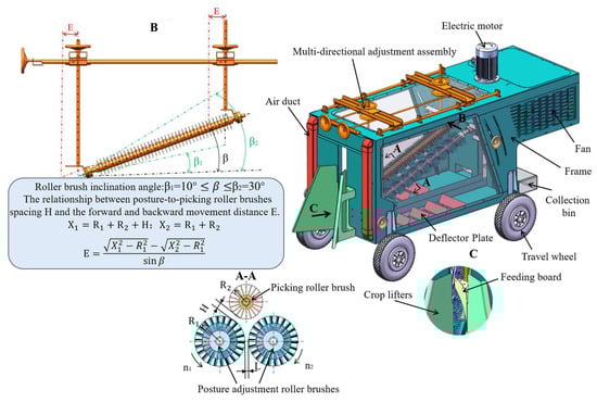 Integrated Machine Structure: A is a partial sectional view, B is a partial front view, C is a partial view, L-gap between two pairs of roller brushes, H-post-to-picking roller brushes spacing.