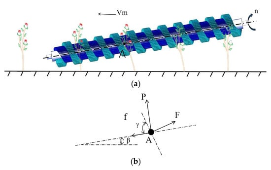 Pose-adjustment analysis of the alignment assembly: (a)—Relative position between safflower plant and spiral roller brushes, (b)—Force analysis at point A on the safflower plant: β = inclination angle of the spiral roller brushes, γ = helix (spiral) angle of the spiral roller brushes, f = frictional force, P = impact force, F = propulsive (driving) force.