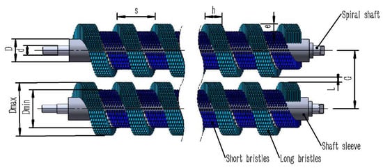 The key structural parameters of the roller brush were designed based on the macro-growth parameters of the ‘Yumin Thornless’ safflower cultivated in the drylands of Xinjiang and the principles of screw conveying [,], as illustrated in Figure 6. The major diameter of the helical blade (Dmax), minor diameter (Dmin), shaft diameter (d), sleeve diameter (D), and helical blade width (e) were determined as 125 mm, 85 mm, 25 mm, 60 mm, and 20 mm, respectively. The pitch of the helical roller brush plays a decisive role in the pose adjustment and conveying of the plant. An excessively small pitch prevents the fruit balls from entering the effective area of the brush bristles, resulting in a lack of axial separation. Conversely, an excessively large pitch leads to an overly large helix angle of the blade, causing the axial component of the force acting on the flower stem to be less than its elastic recovery force, thereby causing conveying failure. Based on this analysis, and adhering to the design criteria of “pitch > maximum fruit ball diameter” and “axial force > radial force”, the pitch (s) was determined to be 120 mm, and the blade thickness (h) was set to 60 mm [].