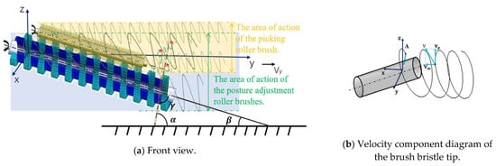 where , , and are the velocity components of point A along the x-, y-, and z-axes, respectively (m/s), and v0 is the circumferential line speed at the outer edge of the roller brush, v0 = ω R. The absolute velocity v of point A is then the magnitude of the absolute velocity v of point A can be expressed as: