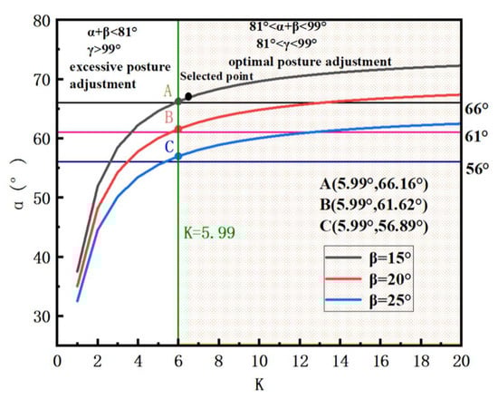 Figure 9 presents the K–α curves obtained for β = 15°, 20°, and 25° within the interval K ∈ [1, 20]. At any fixed K, α decreases monotonically with increasing β. When β = 0° the brush is horizontal and contacts only a narrow height band of the plants, so it cannot accommodate capitula at different elevations, severely limiting adaptability. Conversely, at β = 90° the brush is vertical; the accompanying impact and pushing forces markedly increase plant deflection and lodging risk, which is detrimental to efficient and safe filament harvest. The curves indicate that as K increases, the sum α + β asymptotically approaches 90°. Preliminary experiments comparing bristle–filament contact at various orientations established that the bristles simultaneously engage the base of every filament on an individual capitulum only when 81° < α + β < 99°; this interval therefore defines the operative picking pose that satisfies the adjustment requirement. Specifically: If K < 5.99, α + β < 81°, the fruit ball cannot be re-oriented into the required picking post, resulting in a significant reduction in picking rate. When K ≥ 5.99, α + β enters the acceptable range, and further increases in K progressively fruit ball the picking post, thereby improving harvest quality. However, K should not be increased indefinitely. Excessive rotational speed elevates the absolute picking velocity, which in turn raises the likelihood of damage rate and may even shear entire fruit ball from the stem. Therefore, to balance high recovery with minimal mechanical damage, the design value is set to K = 6. Because larger β values increase the stem inclination and hence the risk of plant damage, β is fixed at 15°.