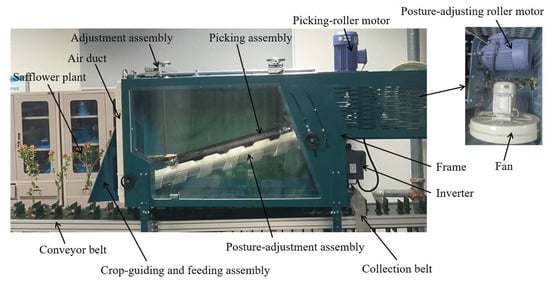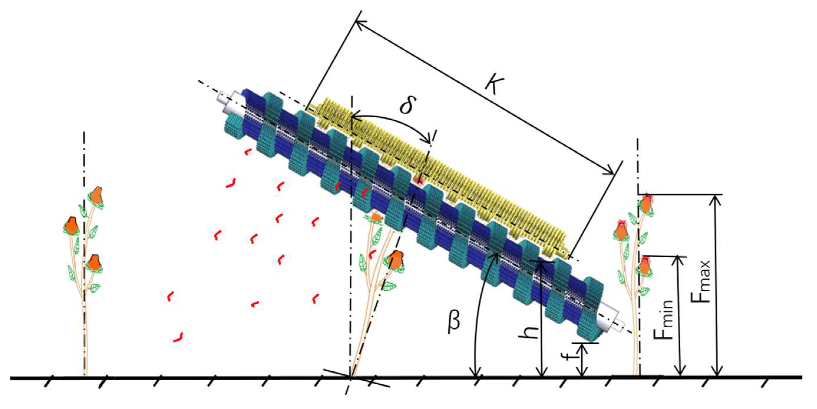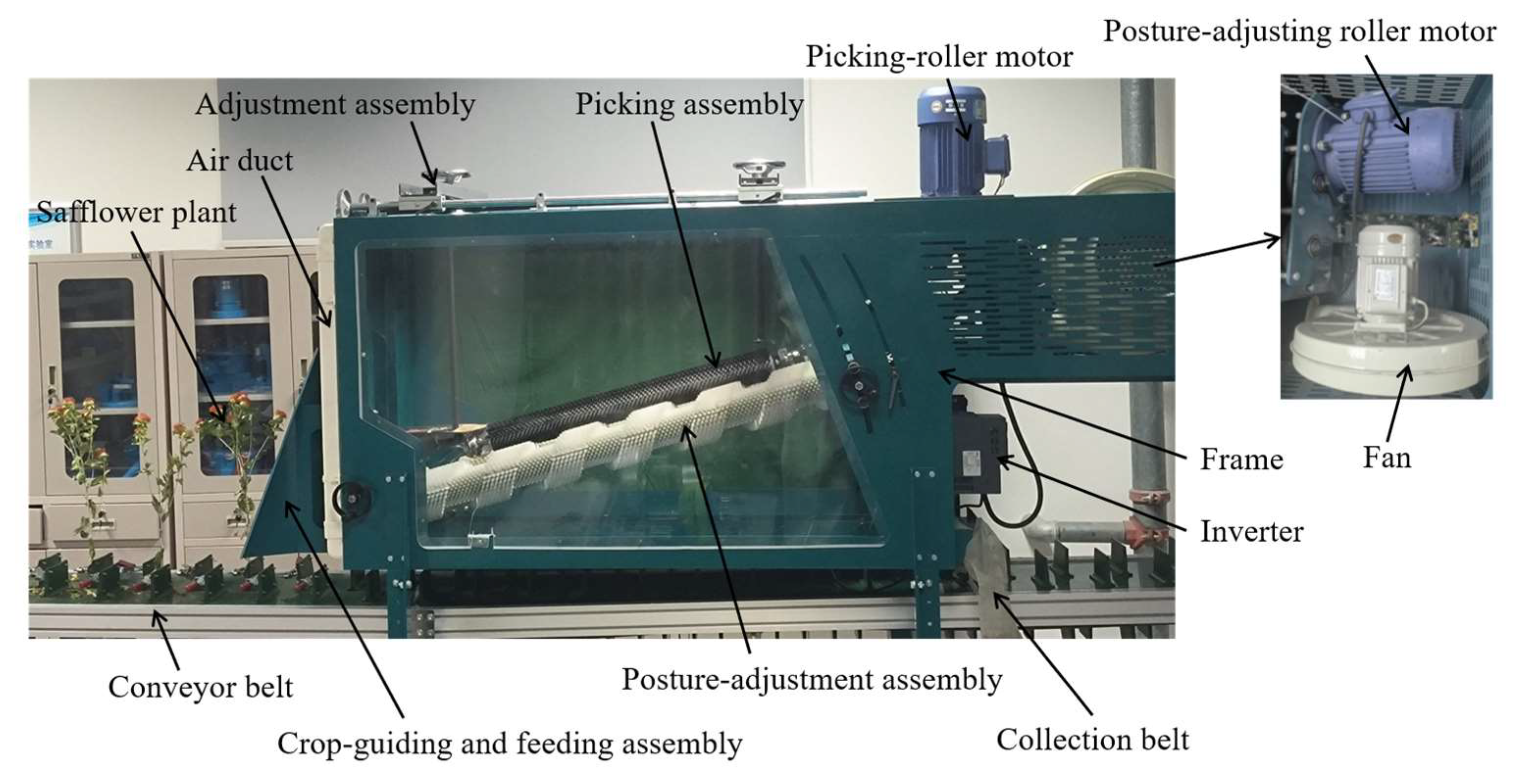 - Chen, Y. Design and Research of Roller-Type Safflower Picking Performance Test Device. Master’s Thesis, Shihezi University, Shihezi, China, 2017. [Google Scholar]