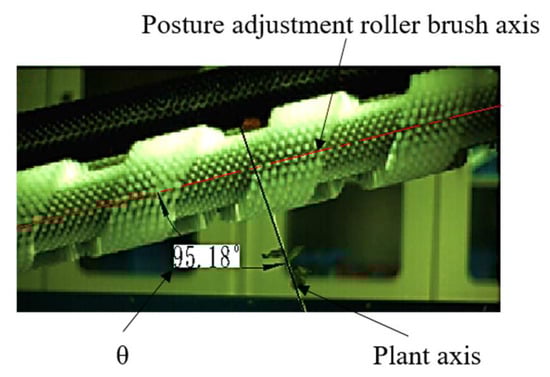 To validate the effectiveness of the previously determined pose-adjustment parameter combination under actual operating conditions, a validation test was designed and implemented. Twenty dry safflower plants were selected for the test. Under constant temperature and humidity conditions, the variation in the plant movement angle was synchronously captured using high-speed photography (1000 fps), as shown in Figure 11. The primary metric was the angle θ between the fruit ball axis and the brush roller axis after adjustment, at this time, the theoretical post angle is 98°. Measured θ ranged from 91.97° to 98.33°, the average is 95.36°, fully within the target interval of 81–99°. The standard deviation was 2.29°, and the root-mean-square error (RMSE) was 3.42°, providing favorable experimental conditions for the subsequent picking tests.