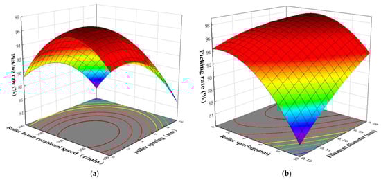 Response-surface plots for picking rate: (a)—Effects of roller speed and roller spacing on picking rate; (b)—Effects of roller spacing and bristle diameter on picking rate. The color gradient follows a rainbow spectrum, ranging from violet to red, where violet indicates the lowest picking ratio and red indicates the highest. The contour lines in the plot illustrate the distribution of the picking rates under different conditions, assisting in identifying the optimal harvesting conditions.