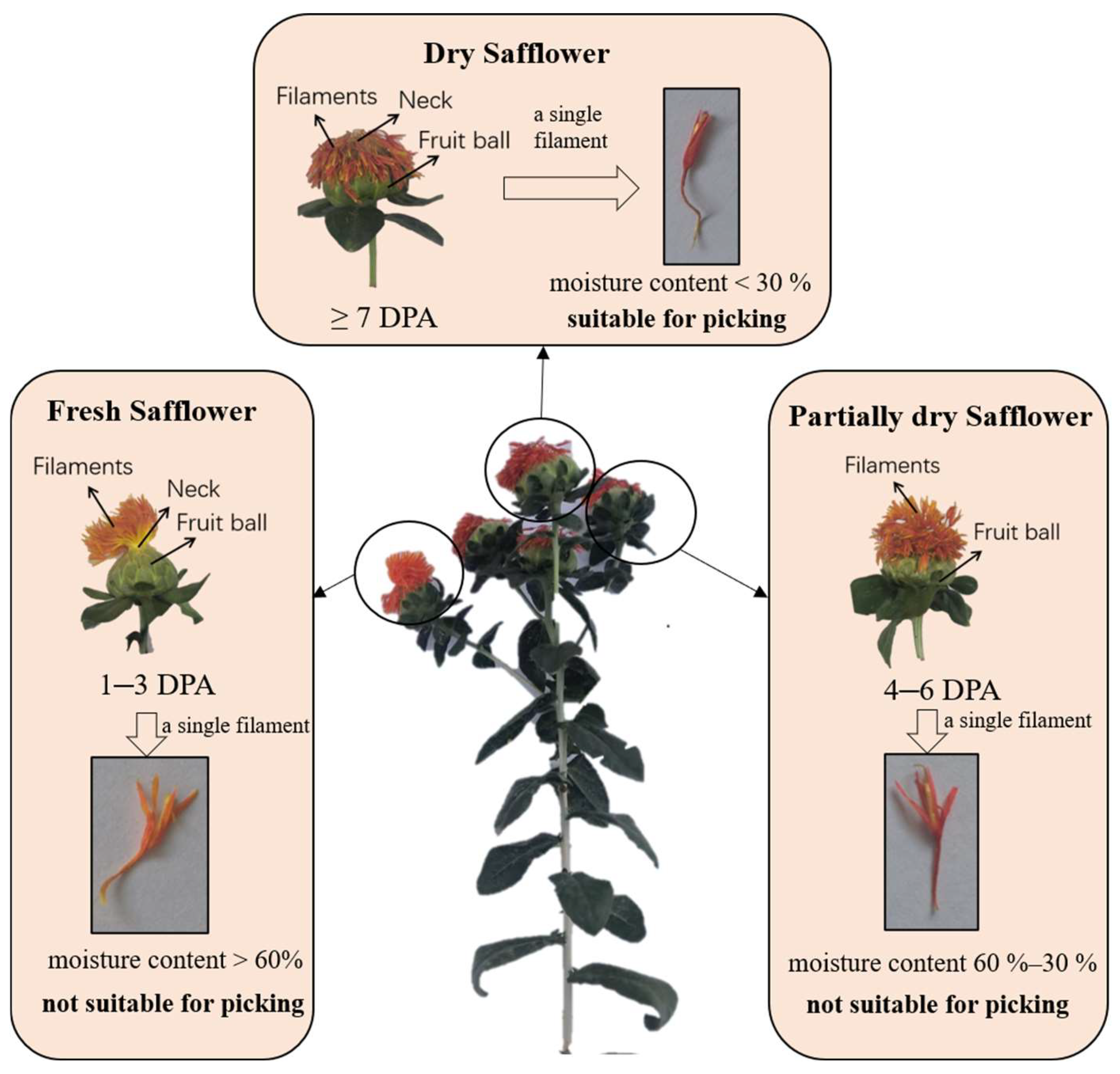 - Ge, Y.; Zhang, L.; Han, D.; Cao, S.; Wang, M.; Lu, Y.; Ying, Y. Current situation and development trend of mechanical harvesting of safflower filaments. J. Agric. Mech. Res. 2014, 36, 265–268. [Google Scholar]