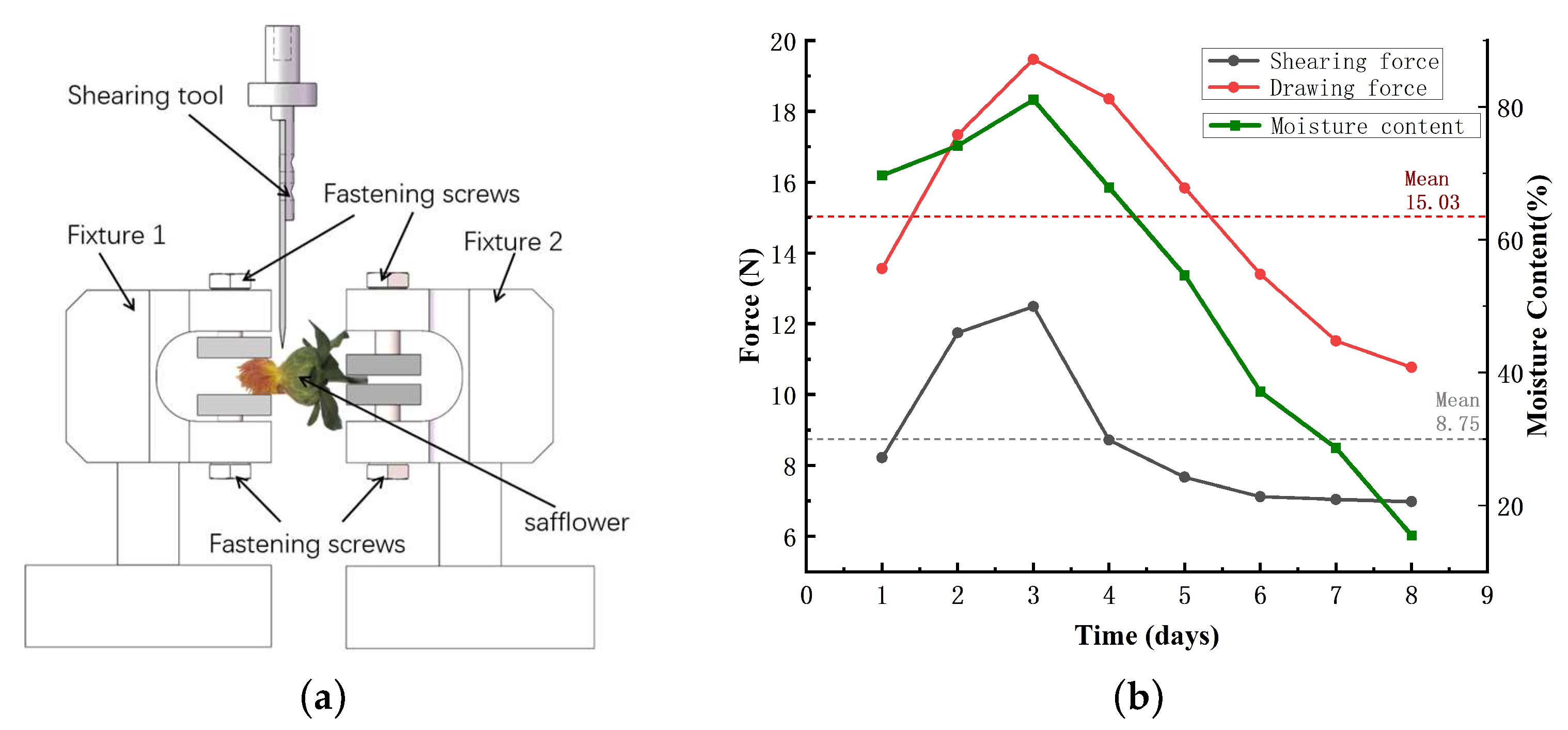 - The ‘Yumin Thornless’ safflower is a terminal-bearing, multi-branched crop. Mechanical tests showed that the average shear separation force (8.2 N) is significantly lower than the pulling force (15.03 N). The shear fracture threshold for a single filament on the seventh day after flowering was 2.9 N, providing a theoretical basis for low-damage shear harvesting.