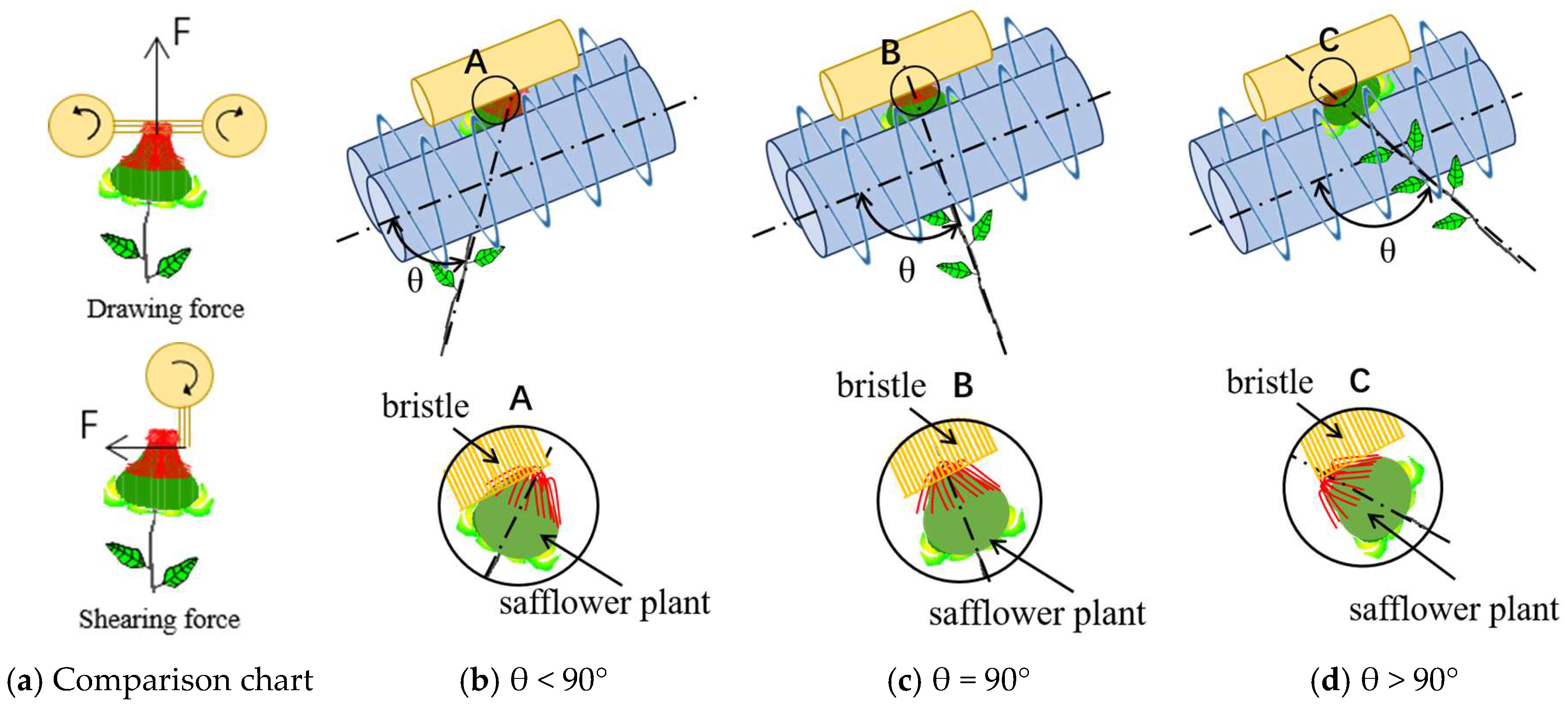 - Zhang, L.; Zeng, H.; Ge, Y.; He, B.; Ma, C.; Guo, Y. Design and experiment of an inclined brush-roller picking device for dried safflower. Trans. Chin. Soc. Agric. Eng. 2025, 41, 40–50. [Google Scholar]