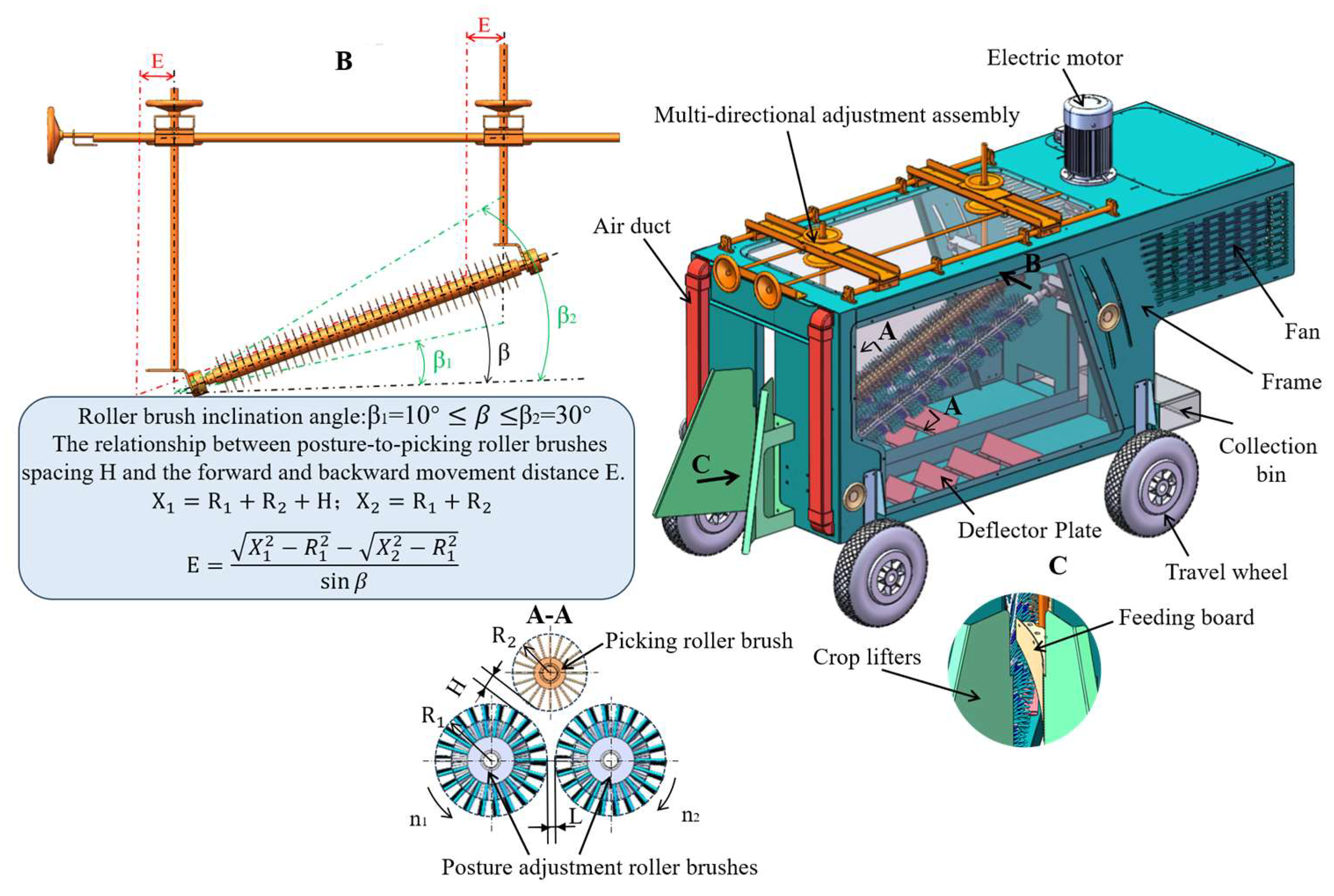 - Sun, C.; Ge, Y.; Zhang, H.; Zeng, H.; Zhang, L. Design and experiment of the vertical brush-roller picking device for dry-safflower harvesters. Trans. Chin. Soc. Agric. Eng. 2024, 40, 203–211. [Google Scholar]
