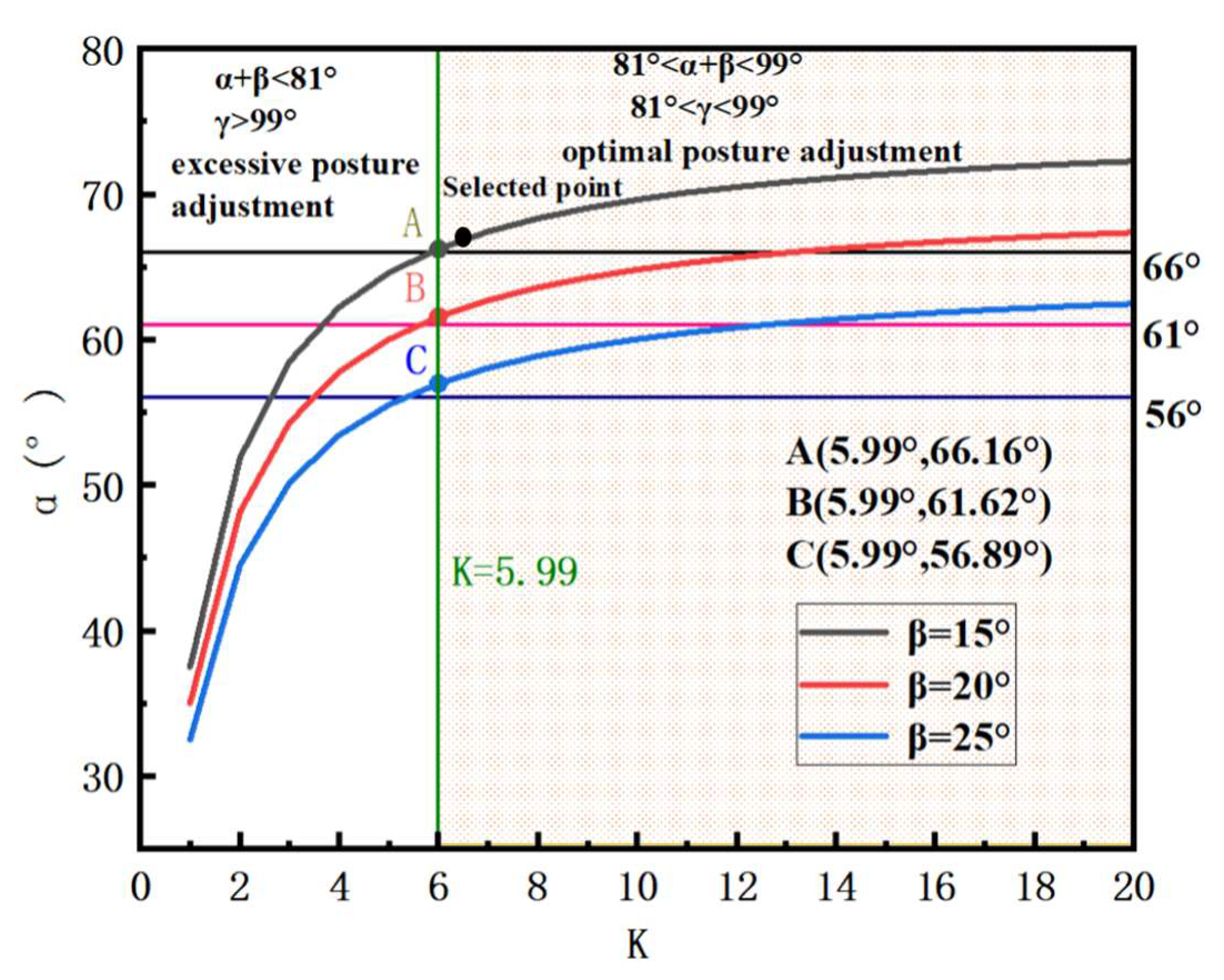 - The key components of the dry safflower harvesting device were analyzed and designed. Mechanical analysis indicated that at the optimal pose-adjustment point A, the plant is subjected to a resultant force of 0–14.33 N to achieve post adjustment from vertical to orthogonal to the roller brush axis; based on this, the structural parameters of the roller brush were selected. The kinematic model revealed that the post angle α and the velocity ratio K determine the adjustment effect. Considering the limiting speed of 600 r/min and efficiency requirements, the final parameters were determined as forward speed = 0.4 m/s, helical roller brush speed = 330 r/min, and inclination angle = 15°.