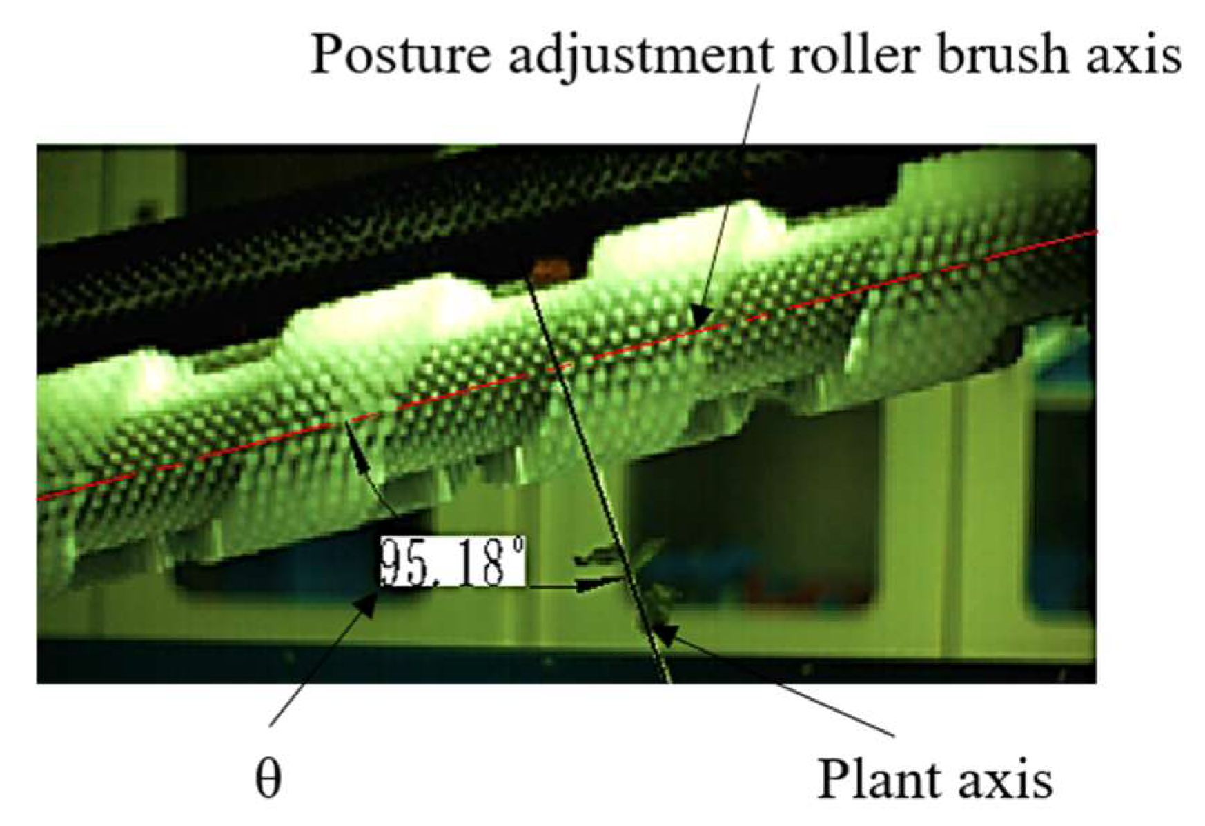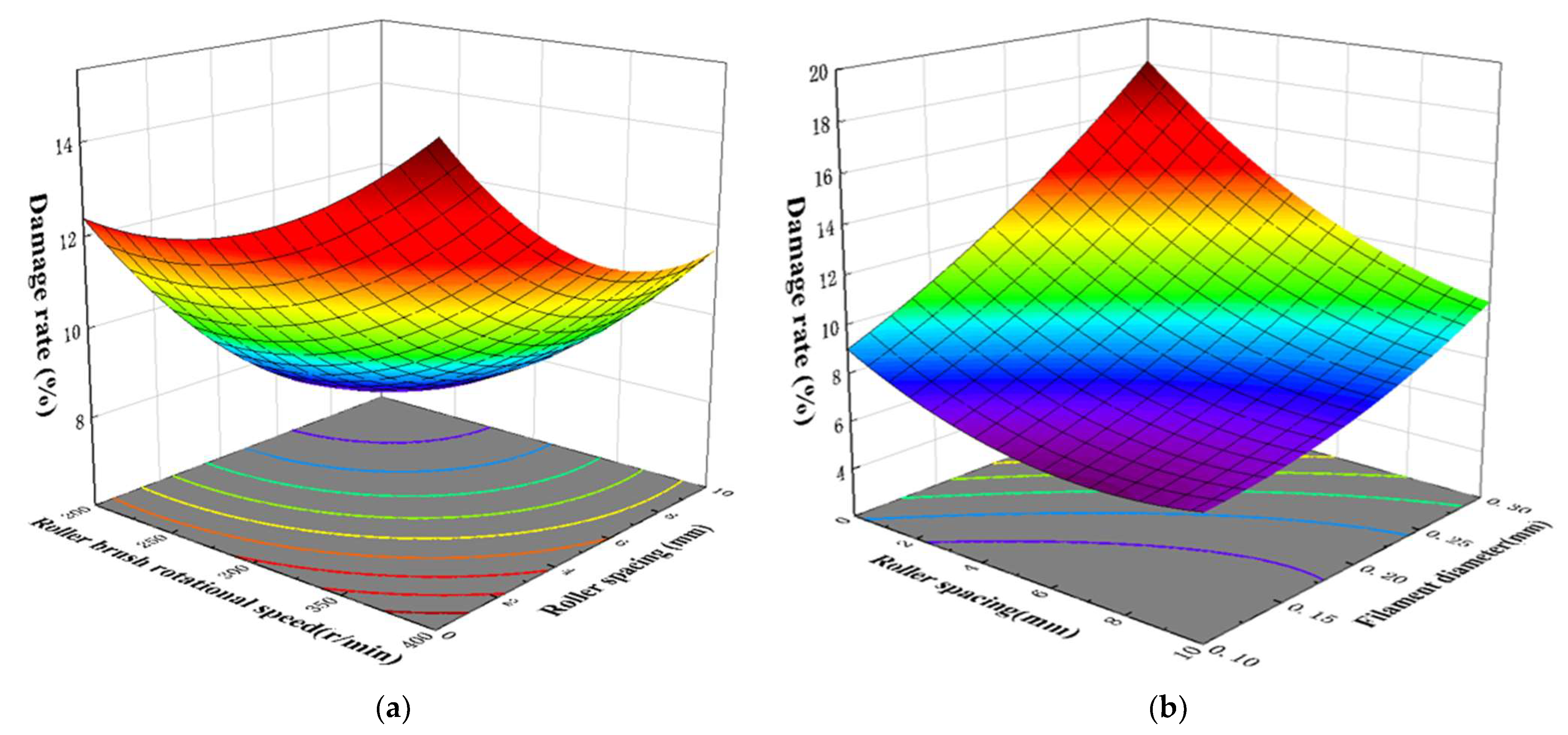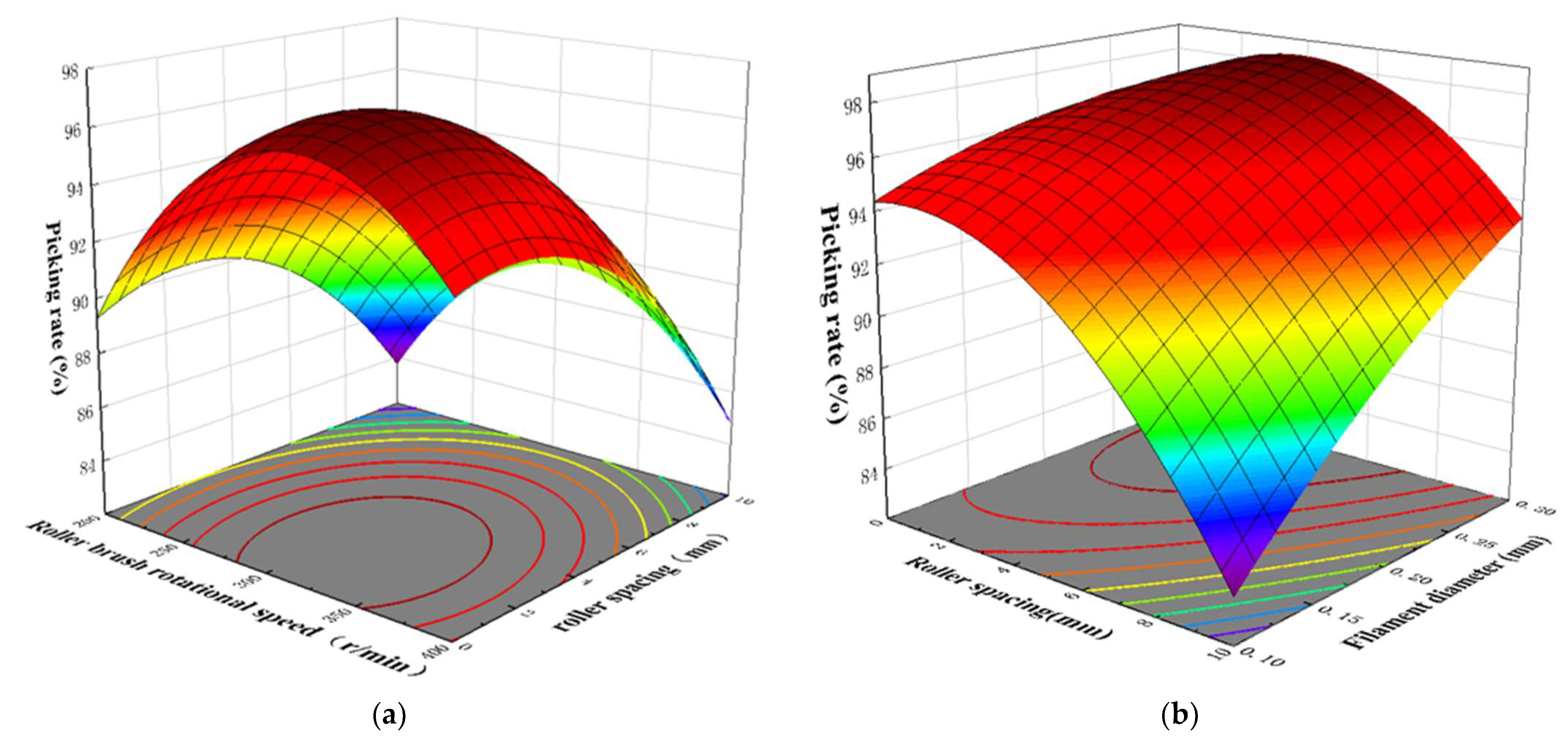 - The pose-adjustment performance validation test, based on theoretical analysis results, showed that the measured average angle between the plant stem and the roller brush axis was 95.27°, falling within the target range of 81–99°. The adjustment accuracy meets the requirements for subsequent picking. Bench tests employing a Box–Behnken design identified the optimal parameter combination for picking as roller brush speed = 282.5 r/min, spacing = 3.7 mm, brush diameter = 0.1 mm. Validation confirmed average values of 91.18% for picking rate, 6.18% for damage rate, and 0.95% for fruit injury rate. The close agreement between measured and predicted values for all indices indicates that the model’s accuracy meets the requirements for optimizing the picking mechanism’s parameters and satisfies the technical code for safflower harvesting.