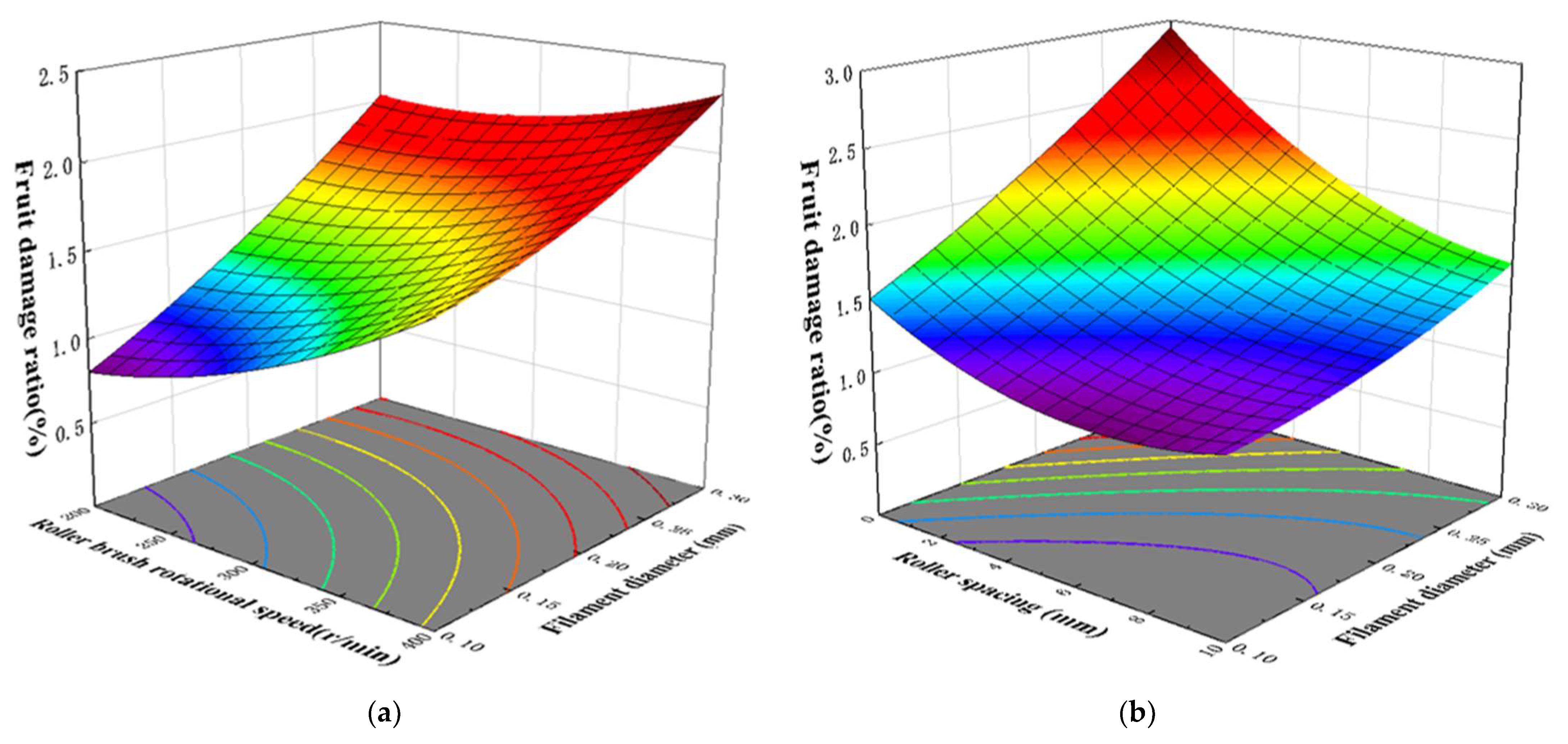 5.4.2. Effects of Factors on the Picking Rate, Damage Rate, and Fruit Injury Rate