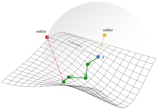 - Step 1. Local error bound for k-distance: For data point pairs p and q within the neighborhood, by the arc-chord estimation inequality in Riemannian geometry:Taking , , and denoting , we have:Therefore, the relative error of the k-distance satisfies: