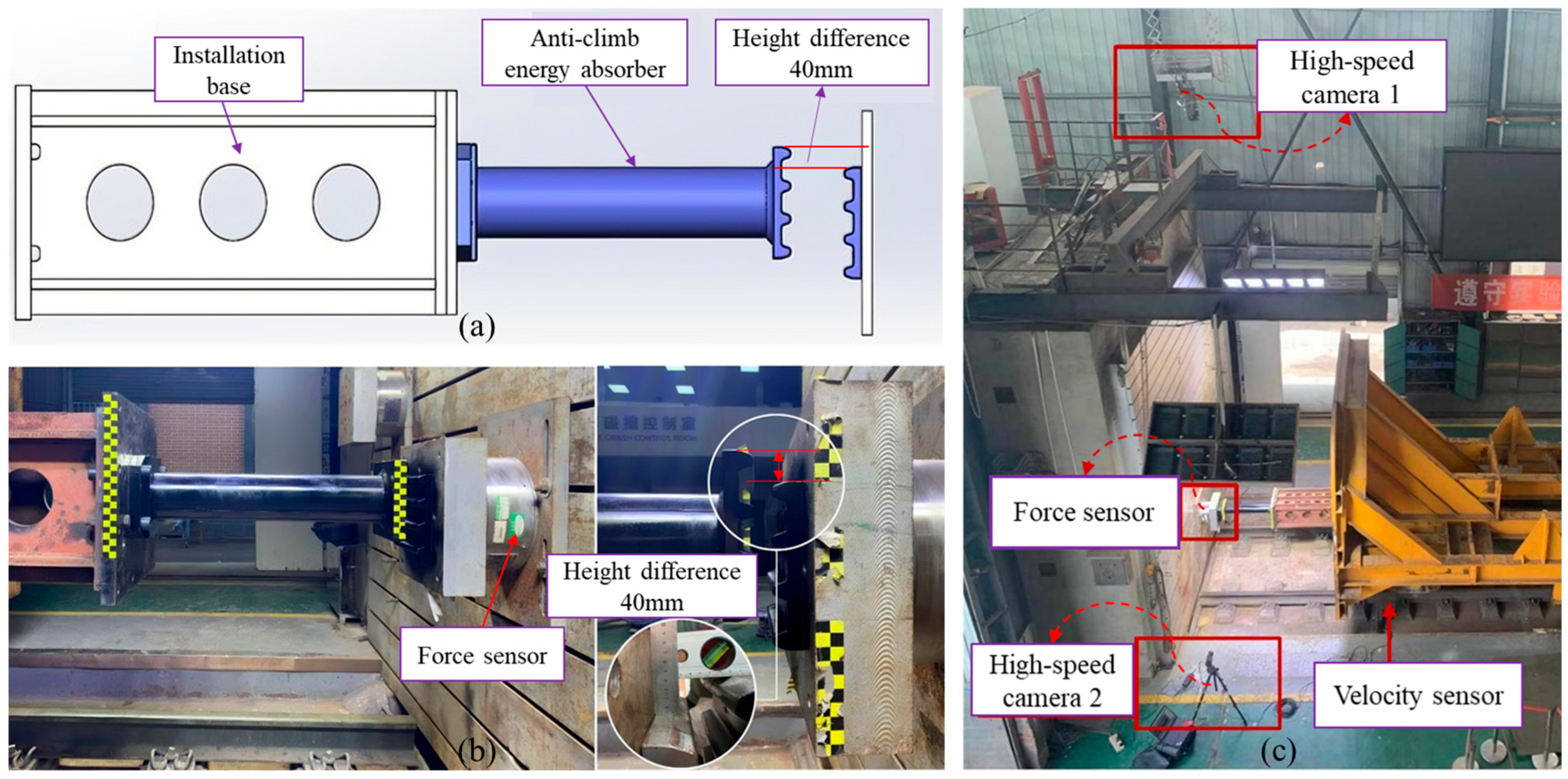 Figure 2. The CAEA was installed at the front end of a trolley with a mass of 27 t, with only anti-climbing teeth installed on the rigid wall. To ensure the two anti-climbing teeth engage with each other during a collision, a 40 mm eccentric height difference was selected between the two anti-climbing teeth. The trolley was supplied with a certain speed via the power launch system, causing the CAEA at the front end of the trolley to collide with the anti-climbing teeth on the rigid wall. High-speed camera 1 was located above the center point of the collision, high-speed camera 2 was located to the side of the center point of the collision, and the speed sensor was located 2.9 m from the rigid wall, at the position where the CAEA was about to collide with the rigid wall.