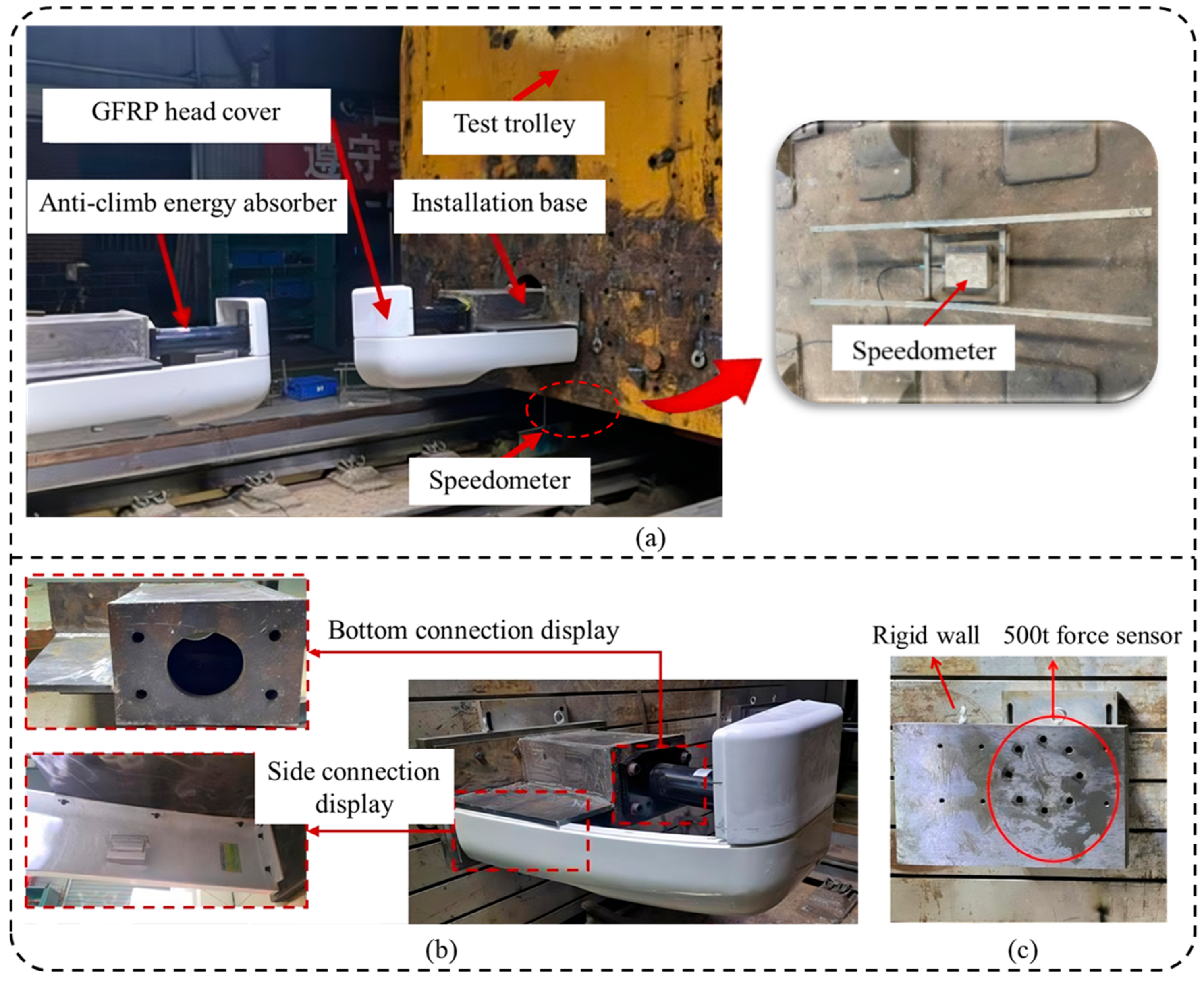 Figure 4. The instruments and equipment used in the collision test of the CAEA with GFRP head cover mainly include a test trolley, power launch system, rigid wall, force sensor, high-speed camera, and speedometer. When designing and installing AEAs for subway vehicles, the vertical dynamic displacement of the train is usually taken into account. According to the European standard EN15227 [