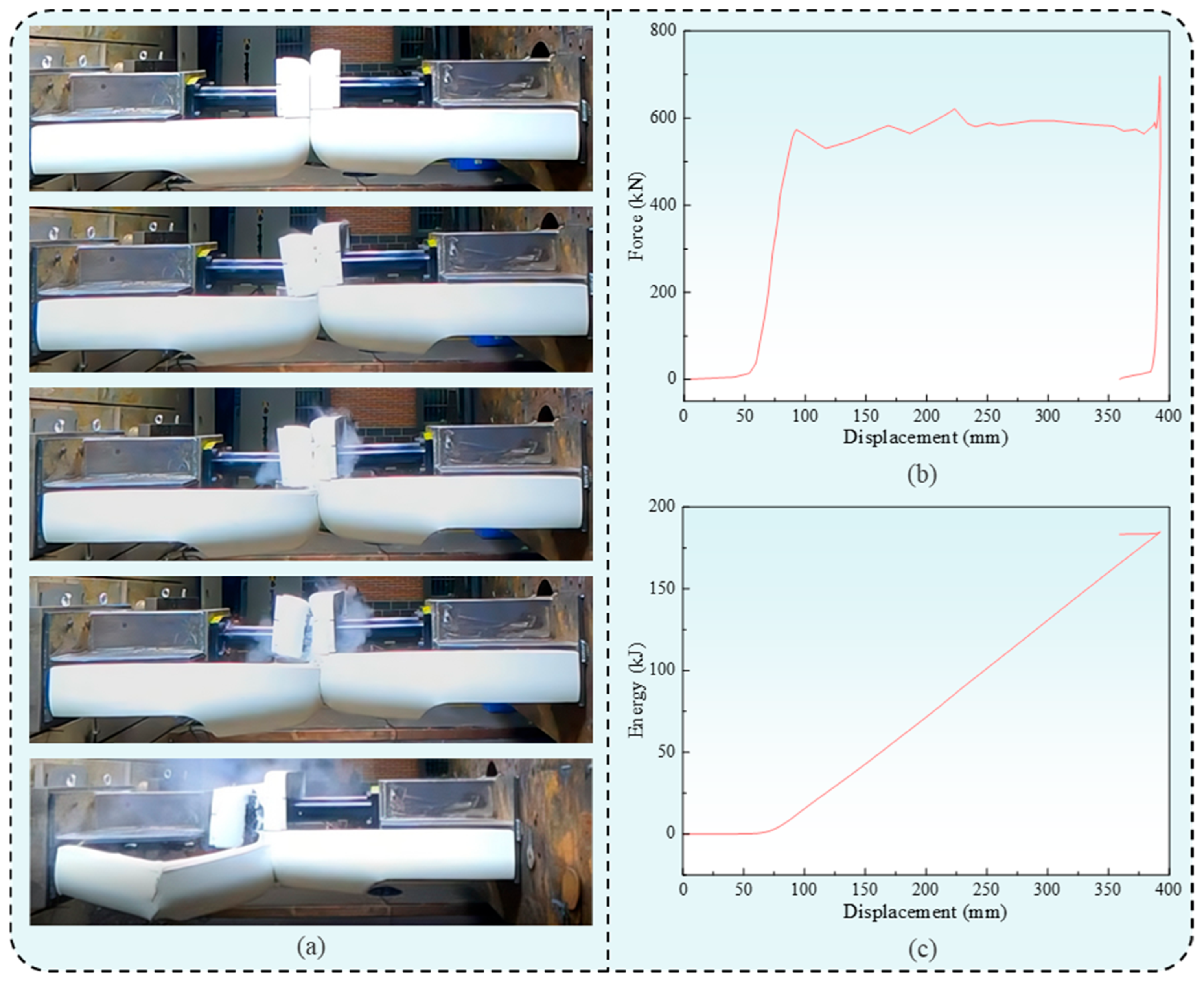 Collision test results: (a) deformation sequence diagram; (b) force–displacement curve; (c) energy–displacement curve.