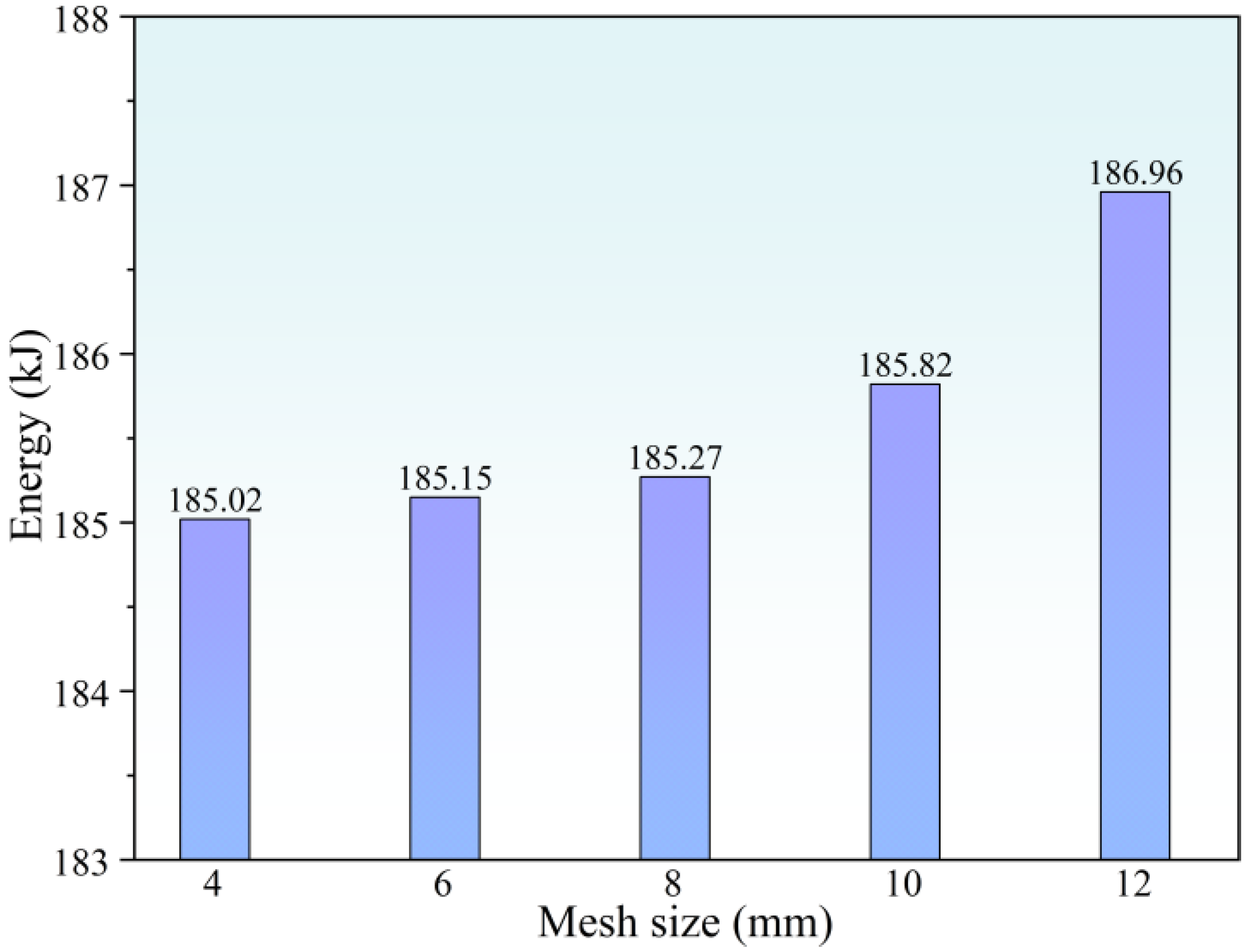 Considering that the installation base and anti-climbing teeth have almost no contribution to energy absorption and taking into account computational efficiency, the mesh size of both the installation base and anti-climbing teeth is selected to be 10 mm. A mesh convergence analysis was performed on the GFRP head cover to determine the appropriate mesh size for the head cover, as shown in