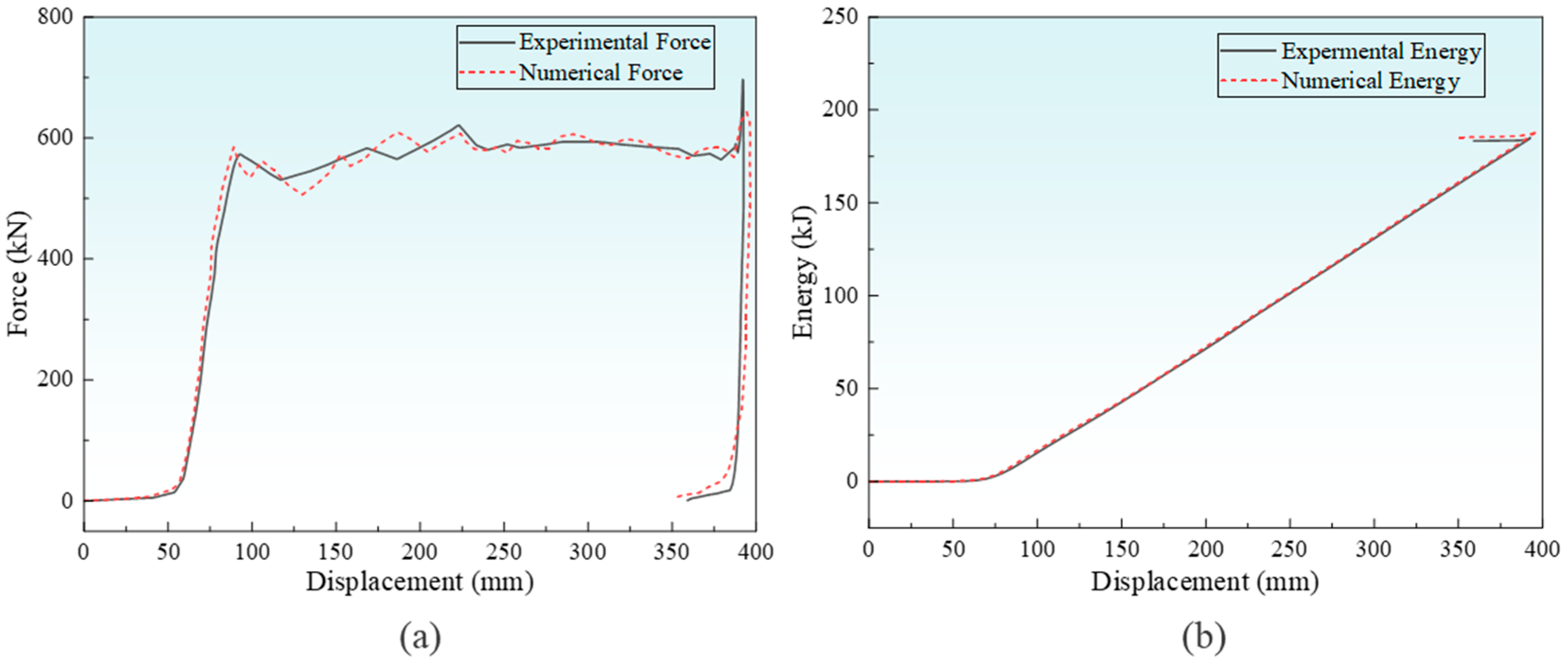 Comparison of experimental and simulation results for the CAEA with GFRP head cover: (a) comparison of force–displacement curves; (b) comparison of energy–displacement curves.
