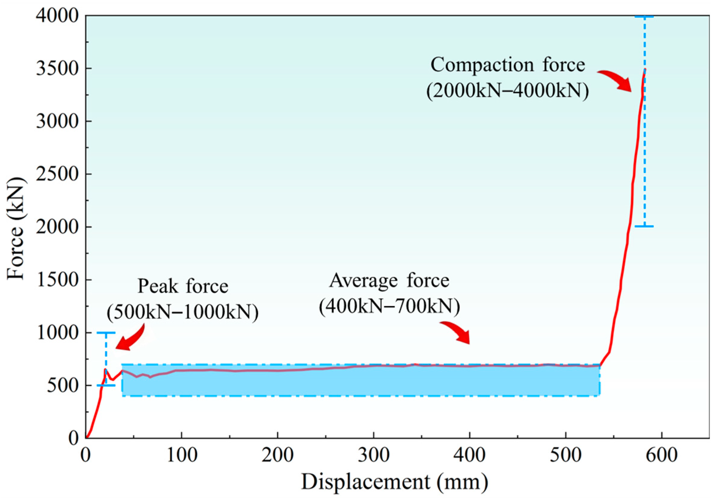 Section 2.2, three mechanical characteristic parameters, namely the IPCF, the platform force, and the compaction force, are extracted from its force–displacement curve for research. The IPCF ranges from 500 kN to 1000 kN, the platform force ranges from 400 kN to 700 kN, and the compaction force ranges from 2000 kN to 4000 kN, as shown in