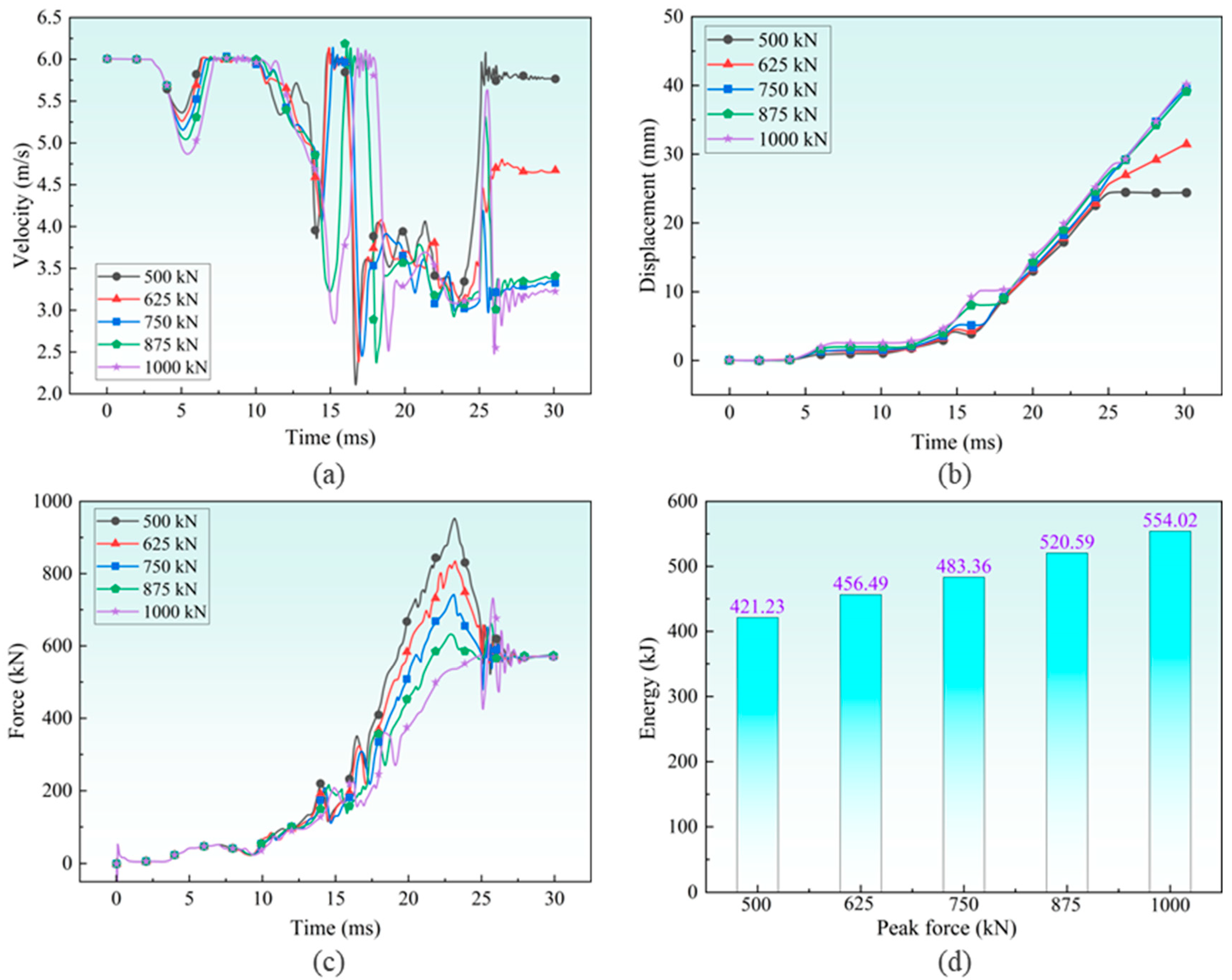 IPCF may affect the time when the GFRP head cover begins to break. To investigate the mechanical behavior changes in the GFRP head cover under different peak forces of AEA, the IPCF values in the force displacement curve were systematically adjusted to 500 kN, 625 kN, 750 kN, 875 kN, and 1000 kN, as shown in