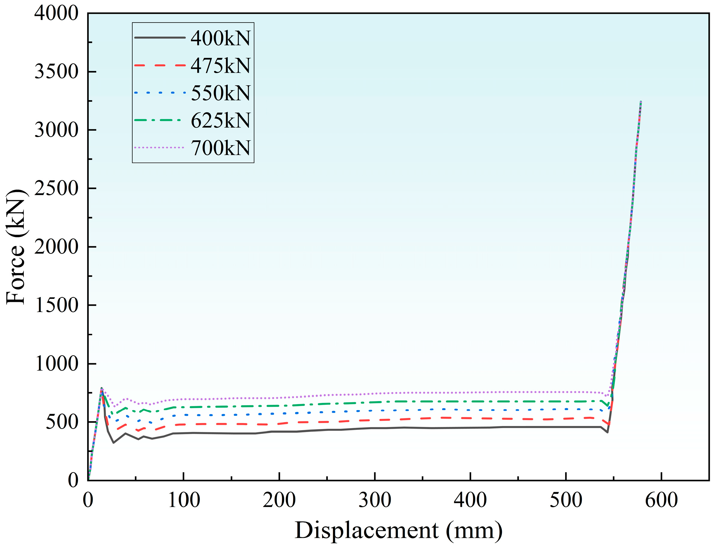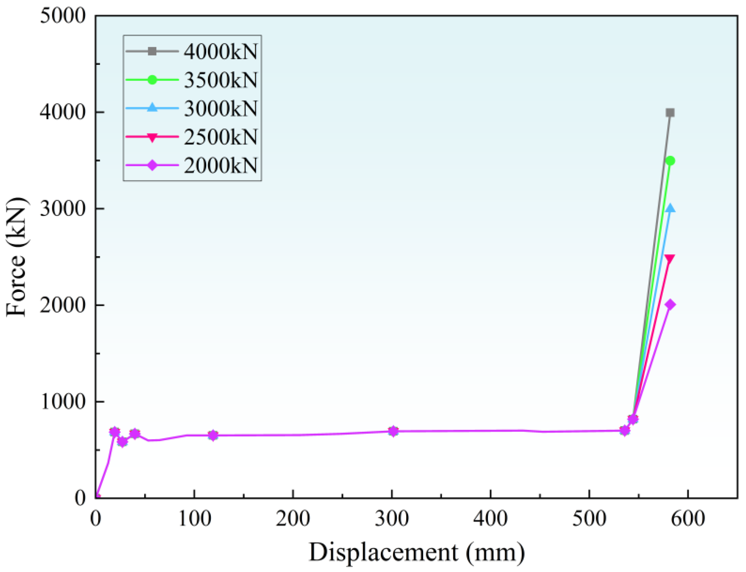 This section investigates the mechanical behavior changes in the GFRP head cover under different AEA platform forces. The platform forces in the force–displacement curve, within the displacement range of 19.7 mm to 543.7 mm, were set to 400 kN, 475 kN, 550 kN, 625 kN, and 700 kN, respectively, as depicted in