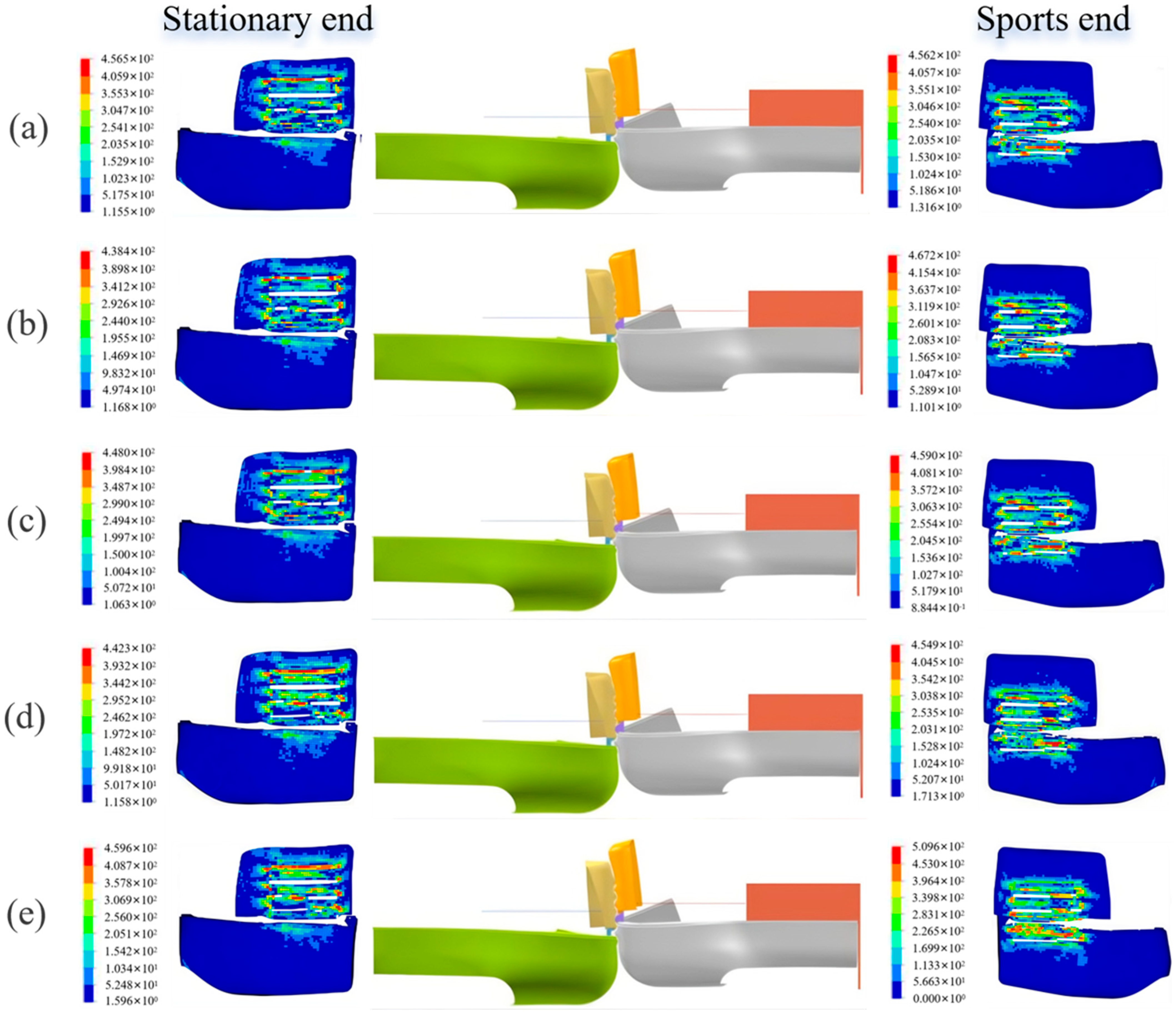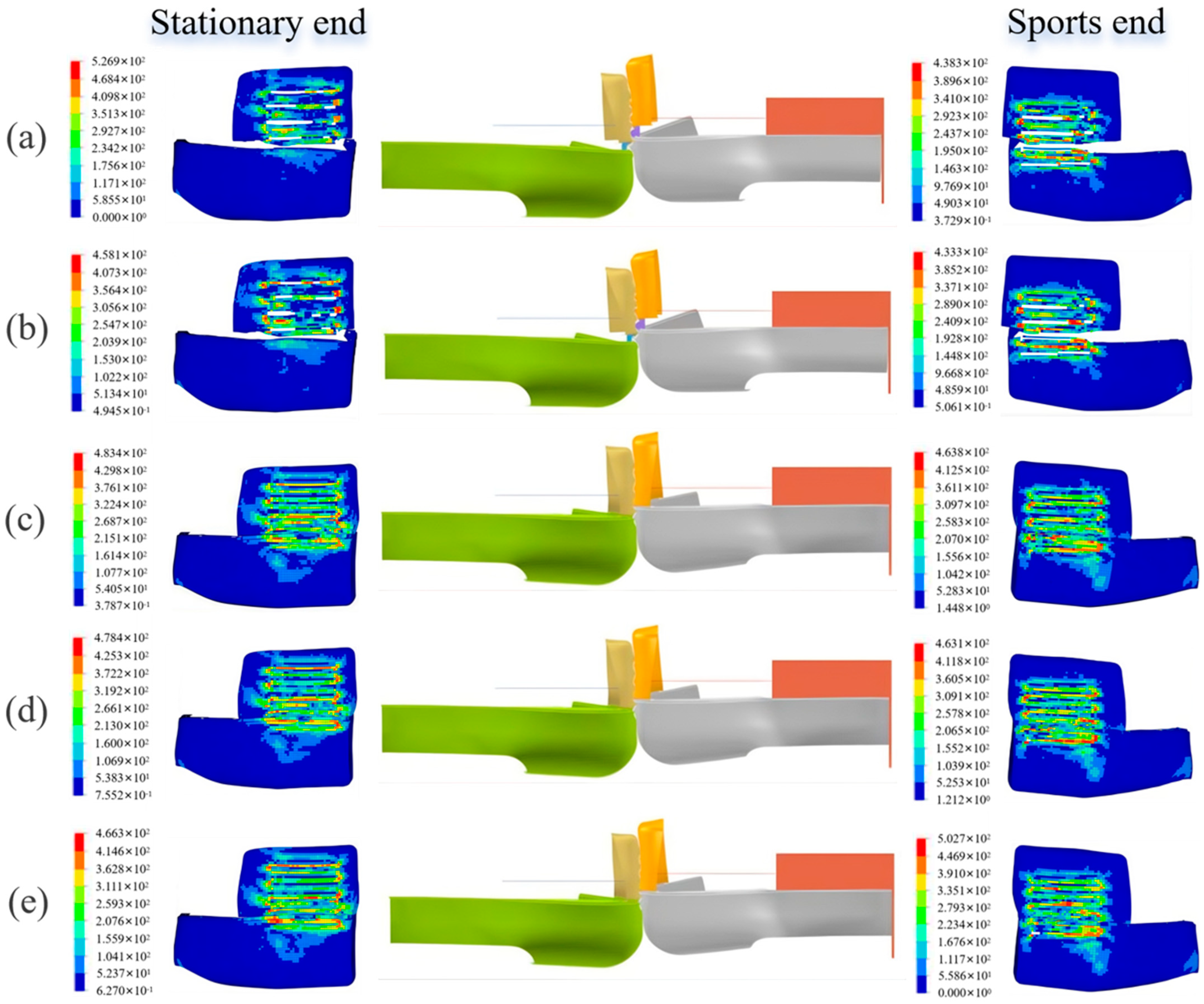 Figure 14 shows the deformation and stress cloud diagrams of the GFRP head cover under different IPCFs. It can be found that after the collision, the lower half of the moving end of the five groups of GFRP head covers all underwent a certain degree of torsional deformation, and the upper half was pressed out with tooth marks by the anti-climbing teeth, but no significant damage or deformation occurred. As the IPCF increased, damaged pores gradually appeared in the GFRP head cover at the moving end, and the stress gradually increased. The stress of the GFRP head cover at the stationary end gradually decreased with the increase in IPCF, but the difference was not significant.