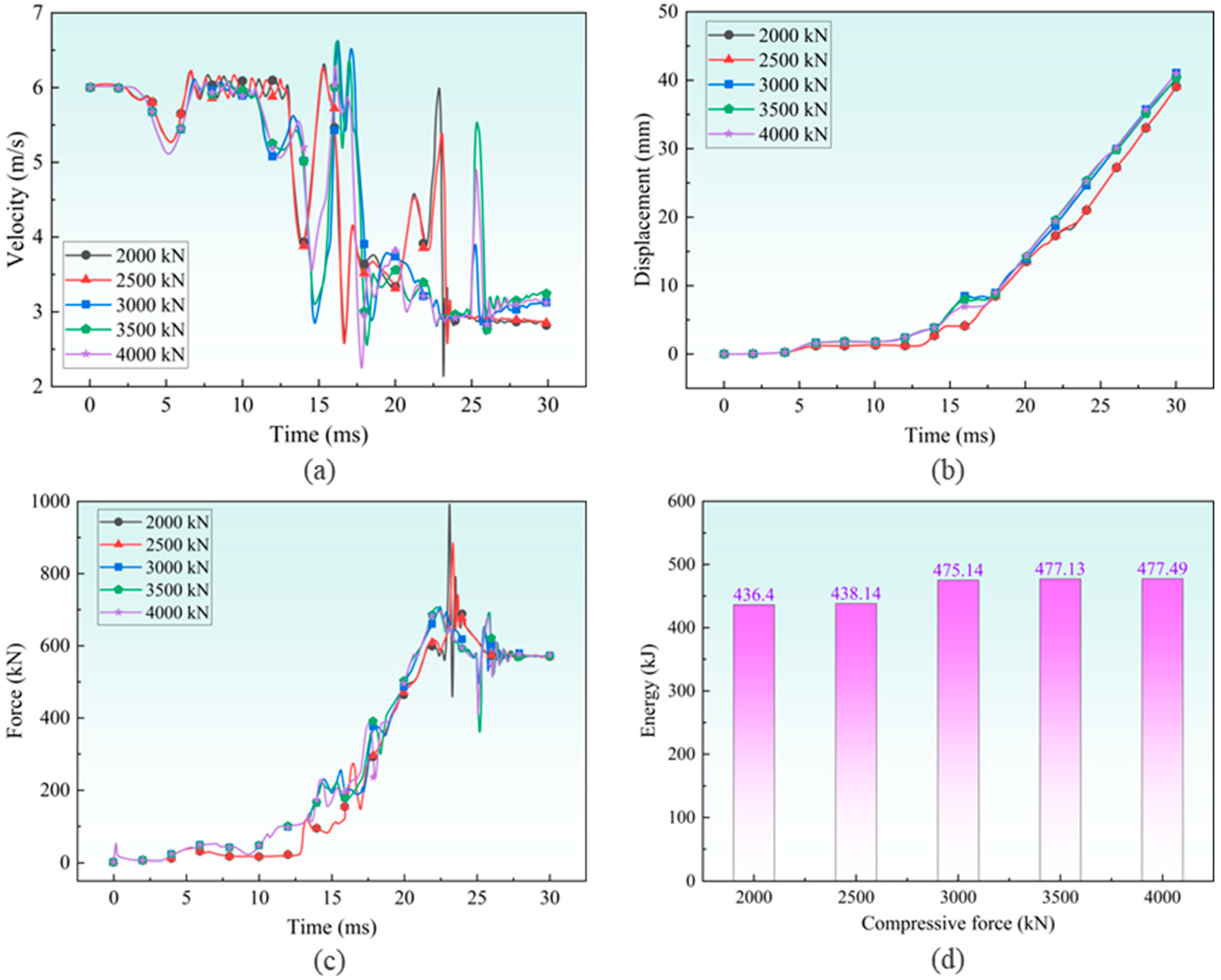 Five sets of collision responses with different compaction forces: (a) velocity–time diagram; (b) displacement–time diagram; (c) force–time diagram; (d) energy absorption diagram.