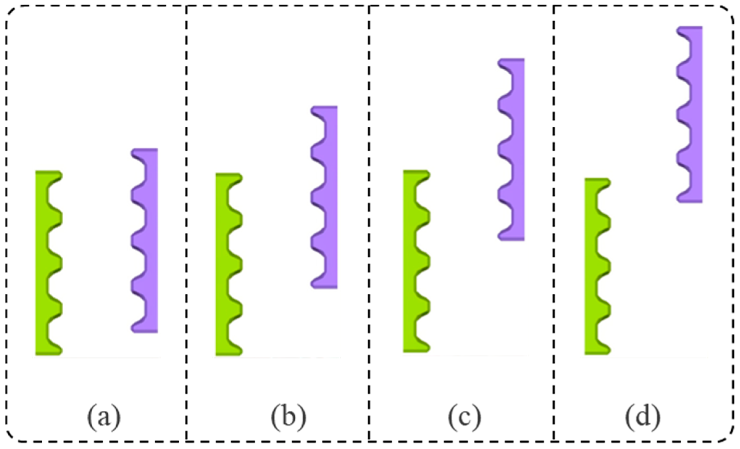 Schematic diagrams of different eccentric height differences: (a) 40 mm; (b) 120 mm; (c) 200 mm; (d) 280 mm.