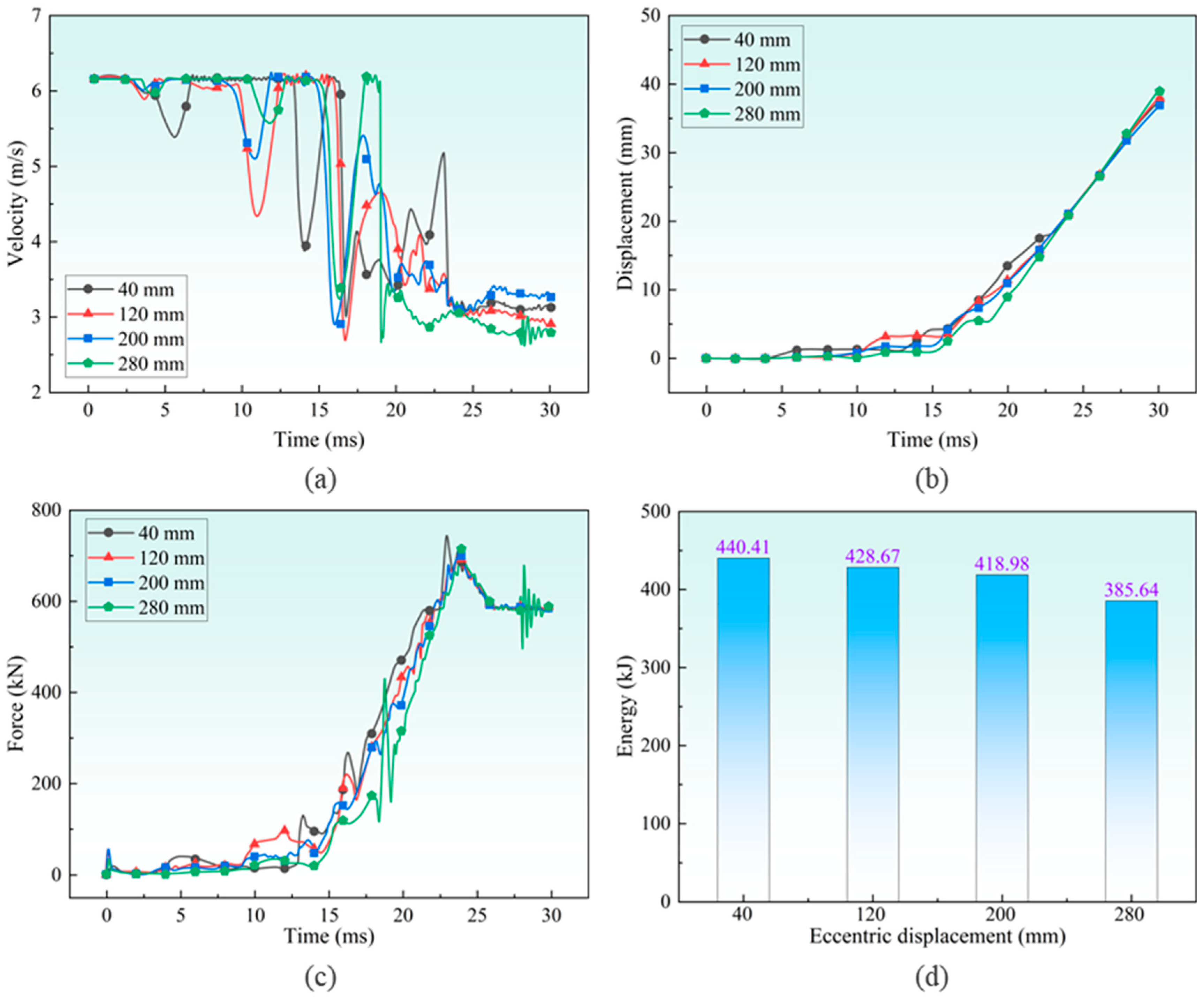 Four sets of collision responses with different eccentric height differences: (a) velocity-time curve; (b) displacement-time curve; (c) force-time curve; (d) energy absorption diagram.