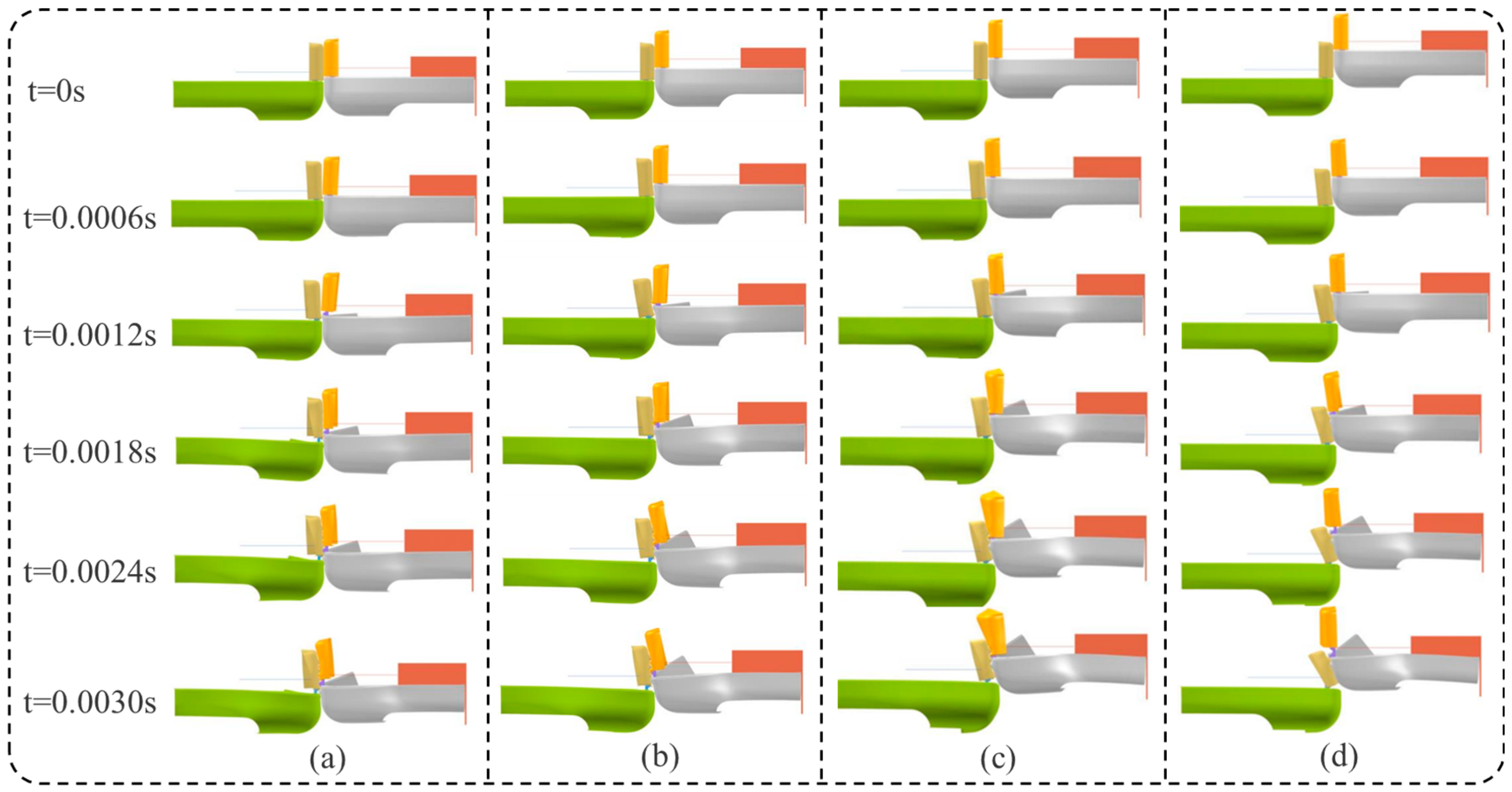 Figure 8 is a comparison diagram of the experimental and simulated collision process sequences. According to the deformation of the GFRP head cover at different collision moments, it can be found that its upper and lower parts are separated in both simulation and experiment, and wrinkles and tears are generated at its front end. At the end of the collision, the GFRP head cover at the stationary end of the experiment suffered a torsional fracture at the connection with the installation base, while only torsion occurred without fracture in the simulation. Considering that the meshing of the CAEA is affected by the collision center position, this difference can be ignored.