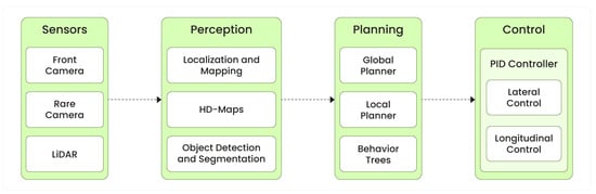ROS2 Middleware: The core of this system is the ROS2 Humble framework, which enables communication among nodes across the Data Distribution Service (DDS) to facilitate publish–subscribe interactions among distributed nodes with minimal latency. Central nodes are navigation, sensor drivers, perception, and control, which are executed on the Raspberry Pi 4 within a real-time executor to allow deterministic running. The configuration of the ROS2 environment uses Quality of Service (QoS) policies that ensure the reliability of important information, such as sensor information, and the best-effort transmission of unimportant information, such as visualization, while ensuring fault-tolerant communications [20].
