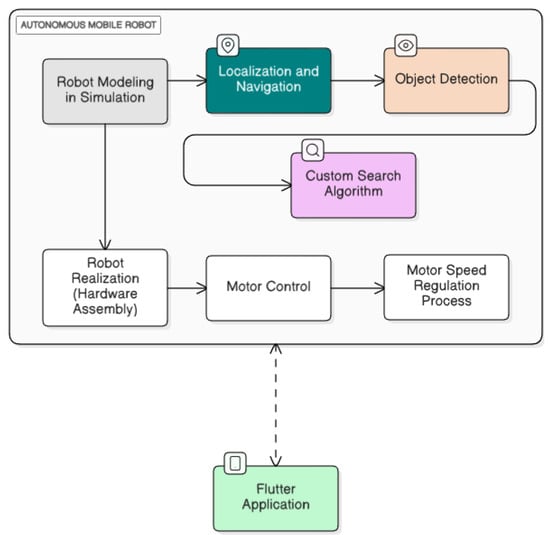 Robot development was carried out using the Agile Scrum methodology with the application of iteration cycles of design, development, and testing with short development sprints. Modeling was performed using URDF and Xacro in ROS2 with the realistic simulation of the chassis, sensors, and kinematics. The LiDAR-based SLAM and AMCL and the NAV2 stack were used for localization and navigation with dynamic path planning in real time. Object detection was performed with YOLO11n on a Raspberry Pi, performing object recognition of household items, while executing a grid-based search algorithm with systematic search. Motor control on the ESP32 used a fuzzy PID controller for precise speed regulation. A Flutter application was used for the real-time display of maps, setting goals, and object search control. Modular development was used so as to enable the iteration and integration of all subsystems with ease. Figure 3 illustrates the stepwise methodological workflow for the design, development, and realization of the proposed system.
