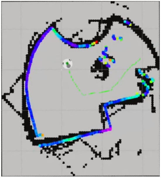 Figure 6. Visualization in Rviz2. - Localization: Adaptive Monte Carlo Localization (AMCL) provides robust pose estimation by combining data from the YDLiDAR TSA LiDAR, MPU6050 IMU (6-DOF orientation at 100 Hz), and wheel encoders (odometry at 200 Hz, sent at 50 Hz over the ESP32). AMCL runs a particle filter of 2000 particles updated at 10 Hz with a probabilistic motion model motivated by the differential drive kinematics (25 cm wheelbase, with a maximum speed of 0.5 m s−1), yielding a localization error of 0.03 m in real-world tests. The tf2 library also manages the transform tree with coordinate frames (e.g., map, odom, base_link, lidar_link), with transformations published at 50 Hz.