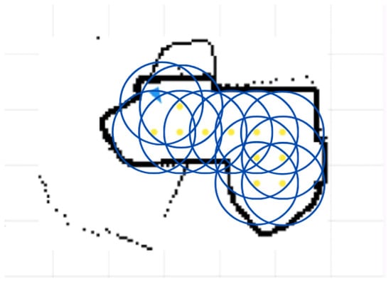 The coverage map, illustrated in Figure 7, shows the overlapping circular fields of view (FOVs) (blue circles) that are utilized to guarantee full room coverage.