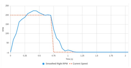 The fuzzy PID outputs according to Formula (10) are graphed in Figure 12 and compared to those of manual PID. There is no overshoot in the plot, with the speed closely tracking the setpoint (e.g., stable at 200 RPM without exceeding it).