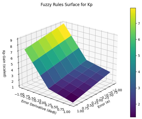 The rules favor fast error correction for large errors (e.g., high Kp and Ki for NB-NB, such as quickly using the brakes if out of control) and weaker gain strength as the error becomes close to zero (e.g., low Kp and Ki for PB-PB), offering stability around the setpoint (target speed). The error, error derivative, and Kp gain interaction are graphically depicted in Figure 11.