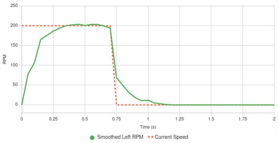 - Low-Pass Filtering for Speed Smoothing: The measured speed is then filtered by a low-pass filter with a cut-off frequency of 25 Hz, thereby reducing measurement noise, and smooth control of the motor speed will be ensured. Here, “noise” denotes undesired signal fluctuations like radio static that could occur due to electrical noise or mechanical vibrations. A low-pass filter is similar to a sieve that accepts slow, gradual variations but rejects rapid, jerky variations, providing stable input to the PID controller. The filtering process uses the recursive Equation (3):where is the filtered speed (the smoothed version), v is the current speed (raw measurement), and is the previous speed reading. In this formula, the old filtered value is combined with a fragment of the new data, creating a gradual smoothing effect.