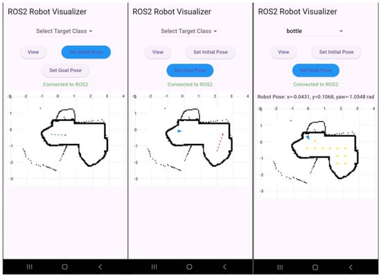 - User Interface Design: The easy-to-understand and user-friendly interface of the app allows users to start tasks (e.g., begin navigating, search objects), see the online status (e.g., current real position), and see the robot’s map. The interface, shown in Figure 13, provides buttons to move the robot in manual mode, provides a view of the map to navigate, and has displays of the status, so users without technical expertise can find it easy to communicate with the robot.
