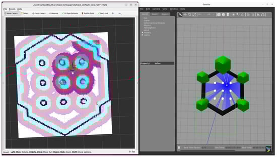 The differential drive system is modeled kinematically. The wheelbase is 25 cm and the maximum linear velocity is 0.5 m s−1 and is computed based on the 600 RPM motors and wheel diameter. Parameterization is achieved via Xacro macros, facilitating the easy modification of the dimensions and sensor locations. The model is also simulated dynamically for correct collision and physics (e.g., friction, inertia) using Gazebo. RViz is also used for the visualization of the robot state, checking for correct transform propagation and alignment of the sensor state. URDF/Xacro files are also streamlined for interaction with the navigation and SLAM stacks of ROS2, ensuring seamless integration with Cartographer and NAV2.