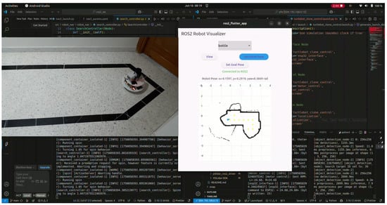 The simulation tests, with Gazebo and RViz2, confirmed the efficacy of the ROS2-based autonomous mobile robot’s control. Gazebo is a 3D physics simulation software program with realistic environment simulations and robotic sensor modeling for system testing, while RViz2 is an ROS2-specific visualization software program with ROS2 real-time displays of sensor information, maps, and robot poses. Gazebo was chosen given its strong physics engine and realistic robotic modeling capabilities, with the accurate emulation of LiDAR, IMU, and wheel encoder data, while RViz2 was chosen given its real-time displays, enabling efficient debugging and the monitoring of performance, a combination that is routinely applied in robotics research. Takaya et al. [34] also used Gazebo and RViz as ROS simulation softwares. As shown in Figure 14, the integration of these sensors ensured correct localization via Adaptive Monte Carlo Localization (AMCL), with a 95% success rate during mapping and navigation through dynamic indoor simulation worlds with moving objects. The dynamic window-based (DWB) controller ensured effective path planning, with the robot succeeding in target waypoints, with an average positional error of 3 cm. The YOLO-based object detection platform, with testing through simulations, properly identified domestic items with a 95% success rate under varying lighting levels. The Flutter app with the WebSocket bridge interface ensured low-latency command responses (<100 ms) and a full real-time view of the robot’s map and status with the smooth handling of tasks. However, the simulation sluggishness under very complex worlds suggests the need to use optimally equipped computing hardware.