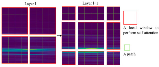 The Swin Transformer network model is a deep learning model based on the attention mechanism, which exhibits excellent performance in image recognition and computer vision tasks. In the diagnostic paradigm of this study, the Swin Transformer is selected as the backbone network for feature extraction, and its core role is to serve as an efficient “global context modeler,” responsible for capturing the long-range dependencies and overall trends of the mill’s operating state from time-frequency maps. As shown in Figure 2, the Swin Transformer adopts a brand-new hierarchical structure. Unlike traditional vision Transformers, it constructs features through the “shifted windows” mechanism illustrated in Figure 3. This design includes non-overlapping local windows and overlapping cross-windows, cleverly confining the computationally expensive self-attention calculations within each small window while enabling the interaction of window information across different levels. This strategy not only significantly improves the efficiency of the model in processing high-resolution images (such as our time-frequency maps) but, more importantly, it can gradually build a global perspective of the entire image while maintaining sensitivity to local information.
