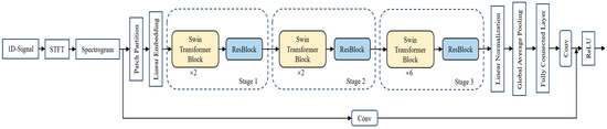 The design philosophy of the RB-SwinT architecture is precisely to realize the “global-local collaborative perception” paradigm described in the introduction. It is not a simple stack of modules, but a deep fusion with complementary functions: the Swin Transformer is used as a global context extractor, and ResBlocks are subtly integrated as local detail refiners. As shown in Figure 5a, a ResBlock module is integrated after each stage of the Swin Transformer. Leveraging its classic cross-layer connections and residual learning capabilities, this module serves two core purposes: First, from a technical perspective, it ensures the trainability of the entire complex model by alleviating the gradient vanishing problem in deep networks. Second, from a feature perspective—which is the key to our design—it provides a “highway” for information transmission of these fine local transient features, ensuring that such critical details do not attenuate or obtain lost in the deep network. This design, where “the backbone captures trends and residuals preserve details,” forms a perfect functional complement to the hierarchical attention mechanism of the Swin Transformer, greatly enhancing the model’s ability to comprehensively represent heterogeneous information in time-frequency maps.