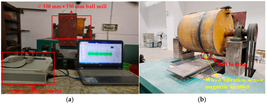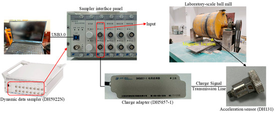 The data acquisition setup for the experimental ball mill is shown in Figure 7a, which mainly consists of three parts: a single ball mill, a dynamic data acquisition instrument (Model: DH5922N, Jiangsu Donghua Test Technology Co., Ltd., Taizhou, Jiangsu, China), and a laptop for real-time monitoring and recording. The acceleration sensor (Model: DH131, Jiangsu Donghua Test Technology Co., Ltd., Jiangsu, China) is installed at the magnetic attachment position (below the ball bearing) as shown in Figure 7b, to collect vibration data transmitted by the ball bearing installed at the bottom of the ball mill. The bearing housing was selected as the measurement point to ensure the acquisition of high-fidelity vibration signals. As a key node for transmitting the internal dynamics of the mill, this location can most comprehensively reflect the overall operating status of the equipment. More importantly, from the perspective of engineering practice, the stable, non-rotating mounting plane provided by the bearing housing is crucial for ensuring the quality and consistency of signal acquisition, and effectively avoids inherent technical challenges such as complex wiring and signal vulnerability to interference when installing sensors on the surface of the rotating cylinder. This strategic selection of measurement points provides a high-quality and high-reliability data source for the model to achieve high-precision classification, serving as the fundamental prerequisite for its optimal performance. The overall schematic diagram of the experimental setup is shown in Figure 8. One end of the dynamic data acquisition instrument is connected to a computing device (a laptop) to ensure accurate and continuous recording of ball mill vibration data; the other end of the acquisition instrument is connected to a charge adapter, which is further linked to the acceleration sensor via a Charge Signal Transmission Line. The sensor is fixed at the designated position in the schematic diagram. The experimental operation procedure strictly follows the working condition scheme in Table 2: First, tungsten ore is fed into the ball mill in accordance with the filling rate and material-ball ratio specified in Table 2, and then the equipment is started. After the equipment operates stably, it is run at a constant speed of 70 r/min (rated speed) and data acquisition is initiated. In this process, the dynamic data acquisition instrument (Model: DH5922N) continuously records vibration signals at a sampling frequency of 20 kHz, with each sample having an acquisition duration of 2 s, to ensure the capture of representative steady-state data. Detailed parameter specifications for the dynamic data acquisition instrument (DH5922N) and the acceleration sensor (DH131) are provided in Table 3 and Table 4, respectively.