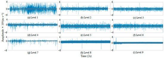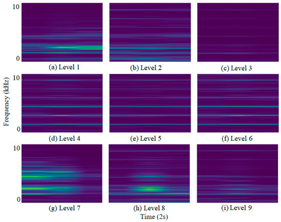 In ball mills, changes in load parameters (such as filling rate and material-to-ball ratio) alter the intensity and frequency of collisions and friction among the “steel balls–materials–cylinder” system inside the mill. This, in turn, leads to characteristic differences in vibration signals across the time domain, frequency domain, and time-frequency domain (STFT time-frequency maps). The two form a direct correlation following the logic of “load determines physical interactions, and physical interactions map to signal features.” Based on this correlation, the characteristic information of the collected vibration signals provides a core basis for ball mill load monitoring. To achieve accurate monitoring, it is first necessary to clarify the load classification criteria. Currently, most scholars classify mill loads into 3 categories [27] (underload, normal load, overload) or 4 categories [28] (no-load impact, underload, normal load, overload) based on the filling rate. However, to characterize the mill’s operating state more clearly, this study classifies mill loads into 9 categories using the filling rate (CVR) and material-to-ball ratio (MBVR). In the experimental setup, the filling rates of 20%, 30% and 40%, and 50% are set to correspond to underload, normal load, and overload states, respectively, with further subdivision based on this. The specific classification criteria are as follows: For the filling rate (CVR): 20% is defined as low filling rate, 30% and 40% as normal filling rate, and 50% as high filling rate. For the material-to-ball ratio (MBVR): 0.1 and 0.3 are defined as low material-to-ball ratio, 0.5 and 0.7 as normal material-to-ball ratio, and 0.9 and 1.1 as high material-to-ball ratio. A total of 9 load levels are obtained through the combination of the above parameters. Figure 9 shows the vibration signals collected from each experimental group; time-frequency maps are generated via Short-Time Fourier Transform (STFT), and the results are presented in Figure 10 (only one time-frequency map is shown for each experimental group).