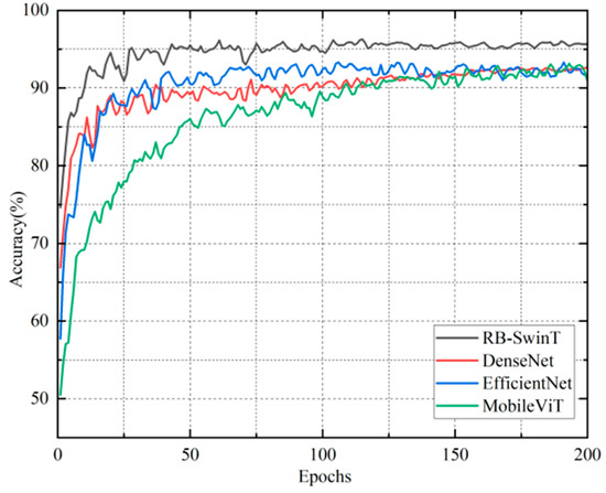 As shown in Figure 11, the training accuracy curves of all models exhibit a rapid upward trend in the initial training stage, indicating that different models can relatively quickly learn discriminative features from the input data. With the increase in the number of iterations (Epochs), the accuracy curves of each model gradually stabilize. Among them, the training accuracy of the RB-SwinT model not only rises significantly faster than those of DenseNet, EfficientNet, and MobileViT in the initial stage, enabling it to capture key features more quickly, but also stabilizes at approximately 95% in the end, which is at a higher level compared to other models. Although the training accuracies of DenseNet and EfficientNet also gradually stabilize, their rising rates and final convergence accuracies are lower than those of the RB-SwinT model. The training accuracy of the MobileViT model starts relatively slowly, and its final stable accuracy is also lower than that of the RB-SwinT model. The performance of the RB-SwinT model, from rising rapidly to stabilizing first and maintaining high accuracy, fully demonstrates its superiority in feature learning ability and convergence characteristics, laying a foundation for its prominent advantages in subsequent model performance comparison and other analyses.