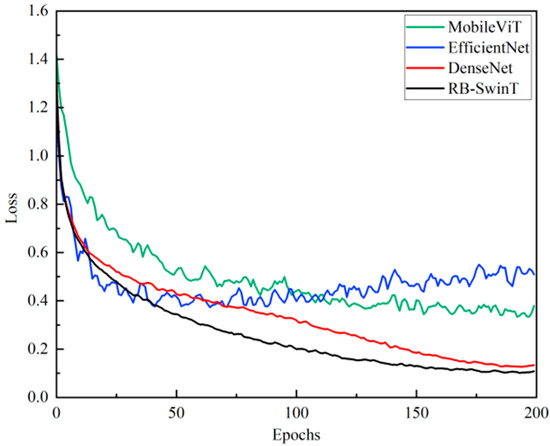 As shown in Figure 12, the training loss curves of all models show a rapid downward trend in the initial stage, indicating that different models can effectively reduce prediction errors. However, with the increase in the number of iterations (Epochs), the loss curves of MobileViT, EfficientNet, and DenseNet gradually flatten out. In contrast, the RB-SwinT model not only has a significantly faster downward rate in the initial stage but also maintains a certain downward momentum, with the final loss value stabilizing at approximately 0.2, which is at a lower level compared to other models. The loss decline process of the MobileViT model has certain fluctuations, and its final stable loss is higher than that of the RB-SwinT model. Additionally, both the loss decline rates and the final converged loss values of the EfficientNet and DenseNet models are inferior to those of the RB-SwinT model.
