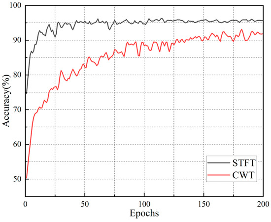Before inputting the one-dimensional vibration signals into each model, it is first necessary to convert them into two-dimensional time-frequency maps through data preprocessing. Specifically, the original time-domain signals are first segmented using a sliding window, where the window width is set to 2048 sampling points and the sliding step is set to 512 sampling points. Subsequently, the Short-Time Fourier Transform (STFT) is applied to each signal segment. According to the analysis in the theoretical section (Section 2.1) of this paper, a Gaussian window is selected as the window function in the transform to achieve the optimal time-frequency resolution, ultimately generating two-dimensional time-frequency images for model input.
