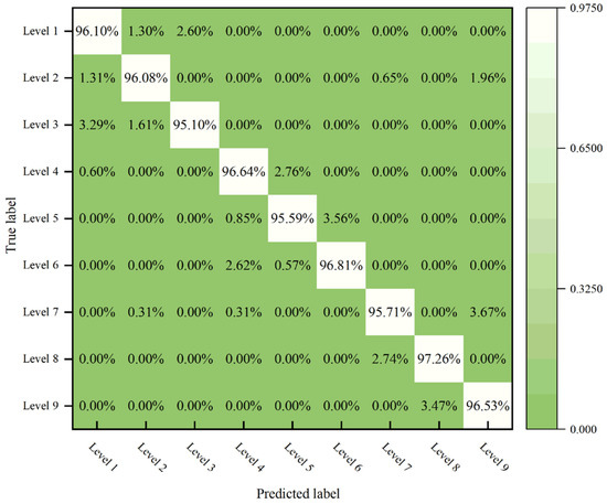 The diagonal elements of the matrix represent the percentage of samples in each category that are correctly classified. It can be clearly seen that the model exhibits excellent recognition performance. For instance, regarding load states such as Level 2, Level 3, Level 6, Level 7, Level 8, and Level 9, the model’s accuracy is close to or even reaches 100%. Even in categories with a small number of misjudgments, the error rate is extremely low. Take Level 1 as an example: 96.10% of the samples are correctly identified, and only 1.30% are misclassified as Level 2—these two are states with relatively similar physical characteristics that are prone to confusion.