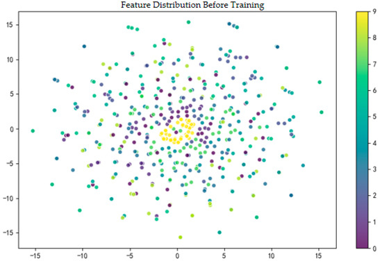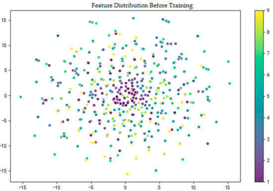 Original Features: As shown in Figure 15, after dimensionality reduction via t-SNE, the original time-frequency features appear as a cluster of highly mixed scatter points in the two-dimensional space. Data points representing 9 different load states (denoted by different colors) are intertwined with each other, lacking any identifiable clustering structure. This intuitively reveals the severe inter-class ambiguity in the original feature space, which originates from the inherent nonlinear and non-stationary characteristics of ball mill vibration signals. This inherent complexity also explains why accurate load identification imposes higher requirements on feature extraction techniques.